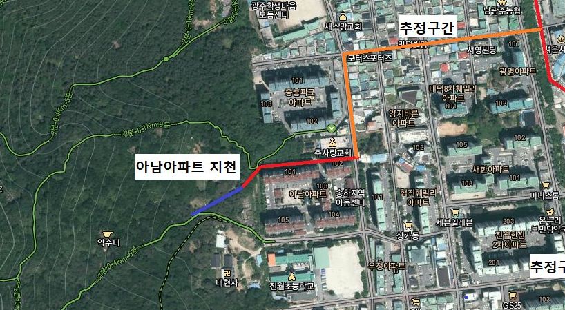아남아파트 옆쪽을 흘러서 아남아파트지천이라 이름붙였습니다. 이 하천도 동네를 개발하는 과정에서 과거 선형이 날라가는 바람에 합류점부터 추정구간입니다...;; 하지만 박스로 합류하는 흔치않은 지천이므로 중요합니다.