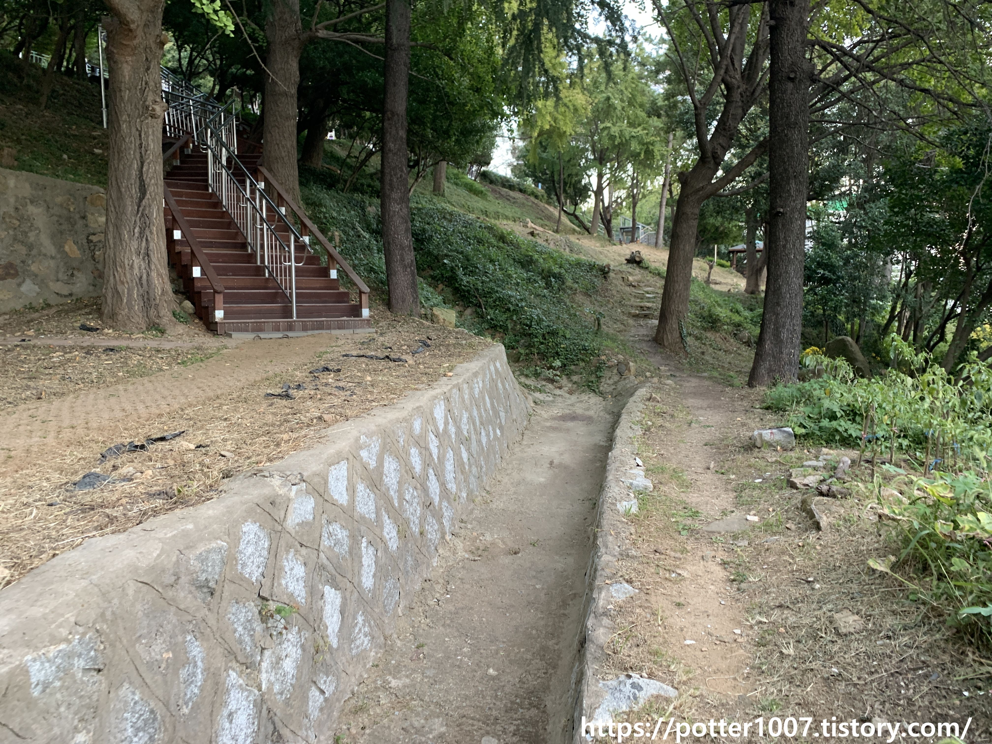 그럴듯한 하천 흔적은 금성아파트쪽으로 들어가야 볼수 있습니다. 사진은 금성아파트 중간에 난 계단 진입로입니다. 왼편이 B동이고 오른편이 A동입니다. 이쪽에도 계단 양편에 하수도용 배수로가 있음을 알수 있습니다.