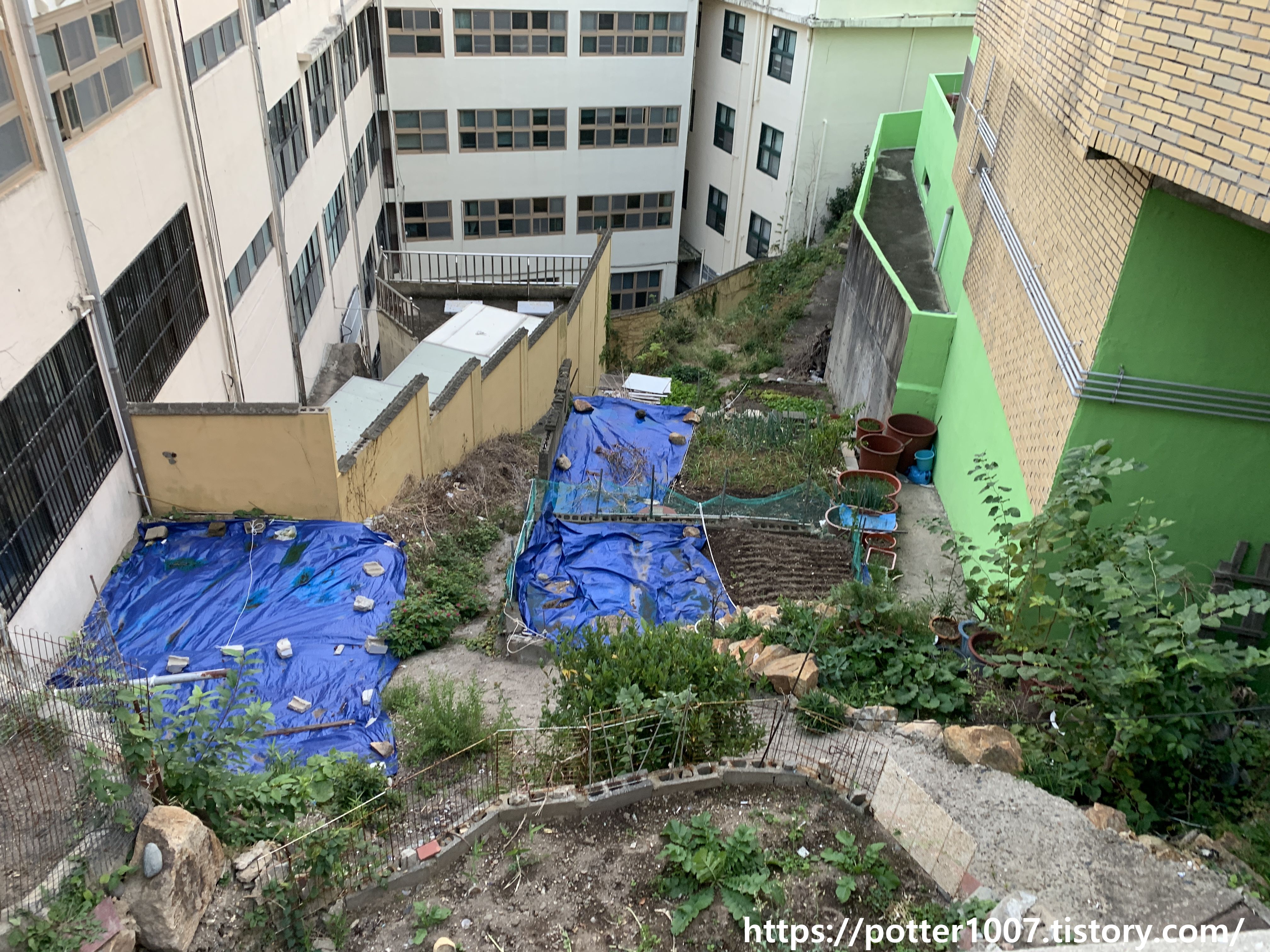 이 텃밭 내려가는길을 잘 보면 사각 철판(빨간색 사각형 안)이 보이는데 바로 박스라서 그렇습니다. ㄷㄷㄷ