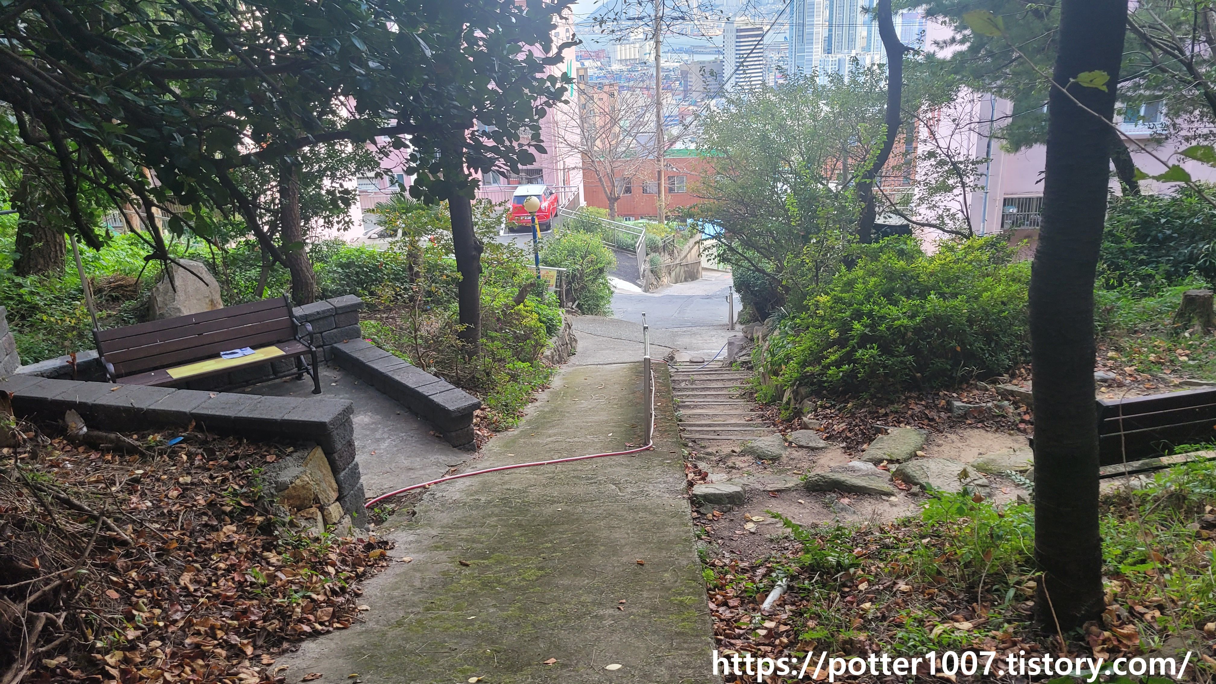 오른편에는 의자가 놓여있는데 사실 이곳은 과거 약수터가 있던 지점입니다. 석축 뒷편에 녹슨 흰색철판에 쓰인 글을 읽어보면 약수터였음을 알수 있습니다.