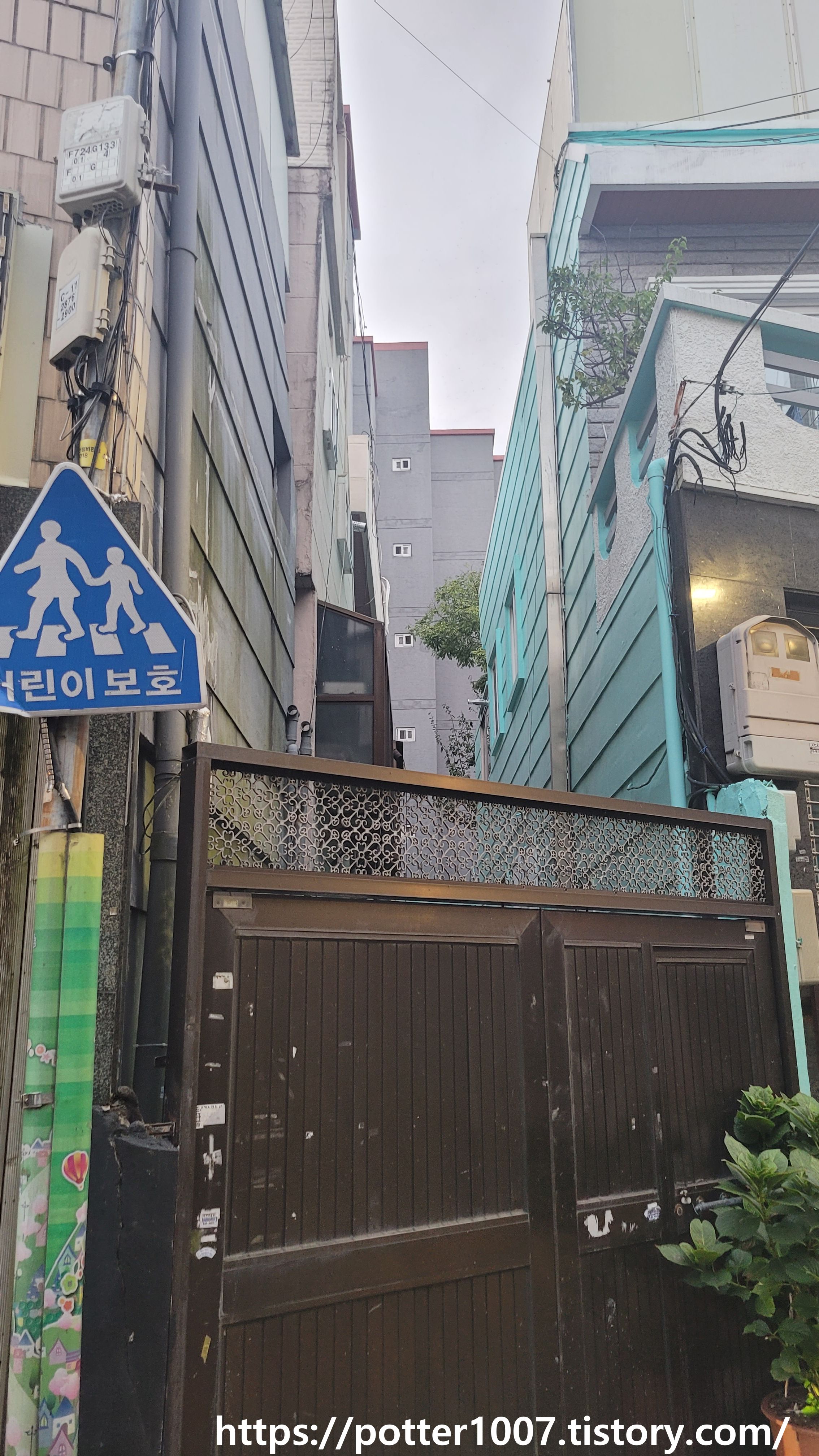 문제는 능풍장 지천이 능풍길을 따라가지 않습니다. 능풍길로 들어갔다가 아까 본 휴대폰가게 건물의 뒷편으로 들어갑니다. 위 사진에 보이는 철문에서 흘러나오는 셈인데, 흔적이 잘 드러나있지 않습니다.