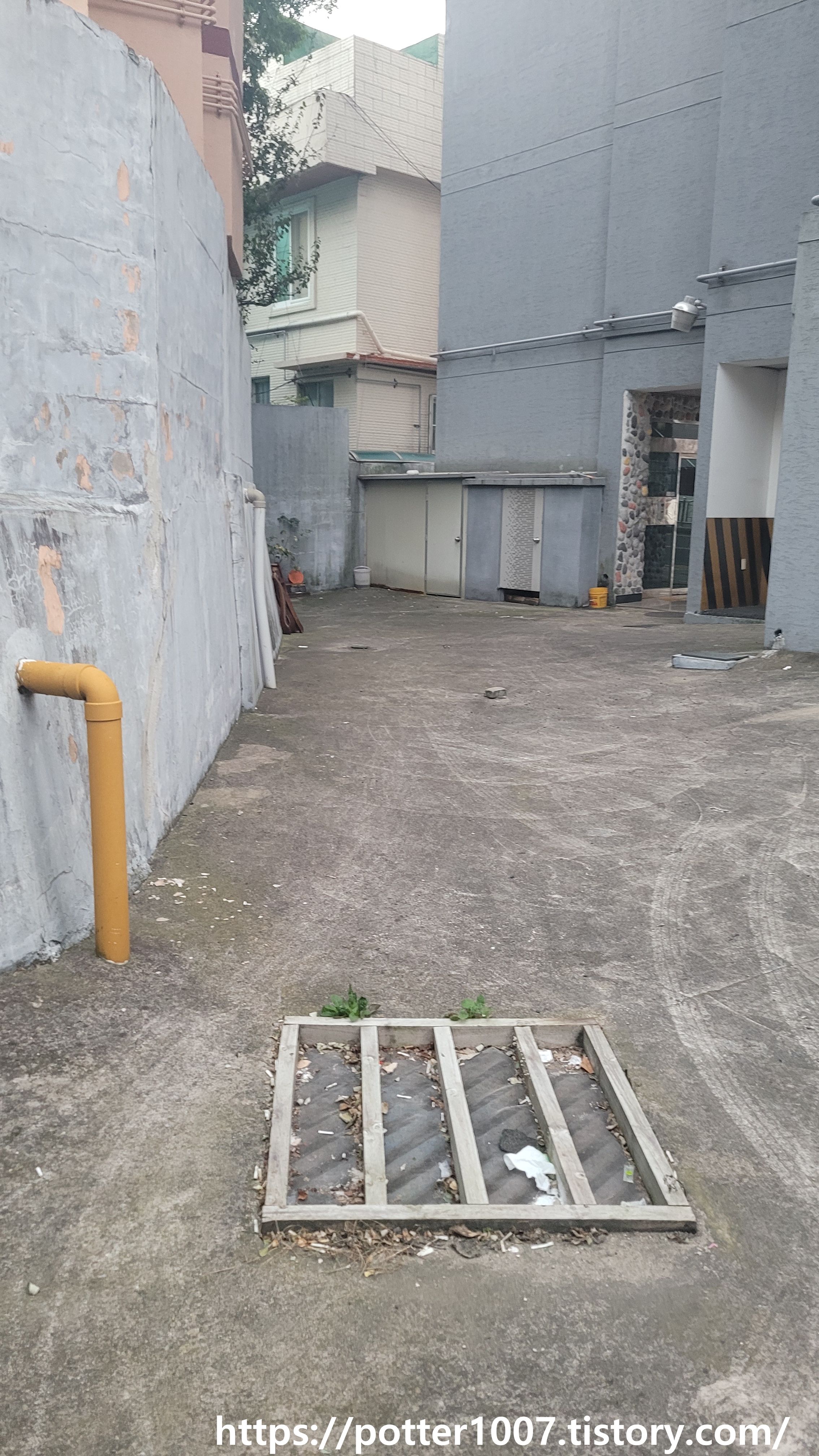 그리고 이방향이 하류방향으로 건물앞에 고무판으로 덮은 배수구가 있습니다.