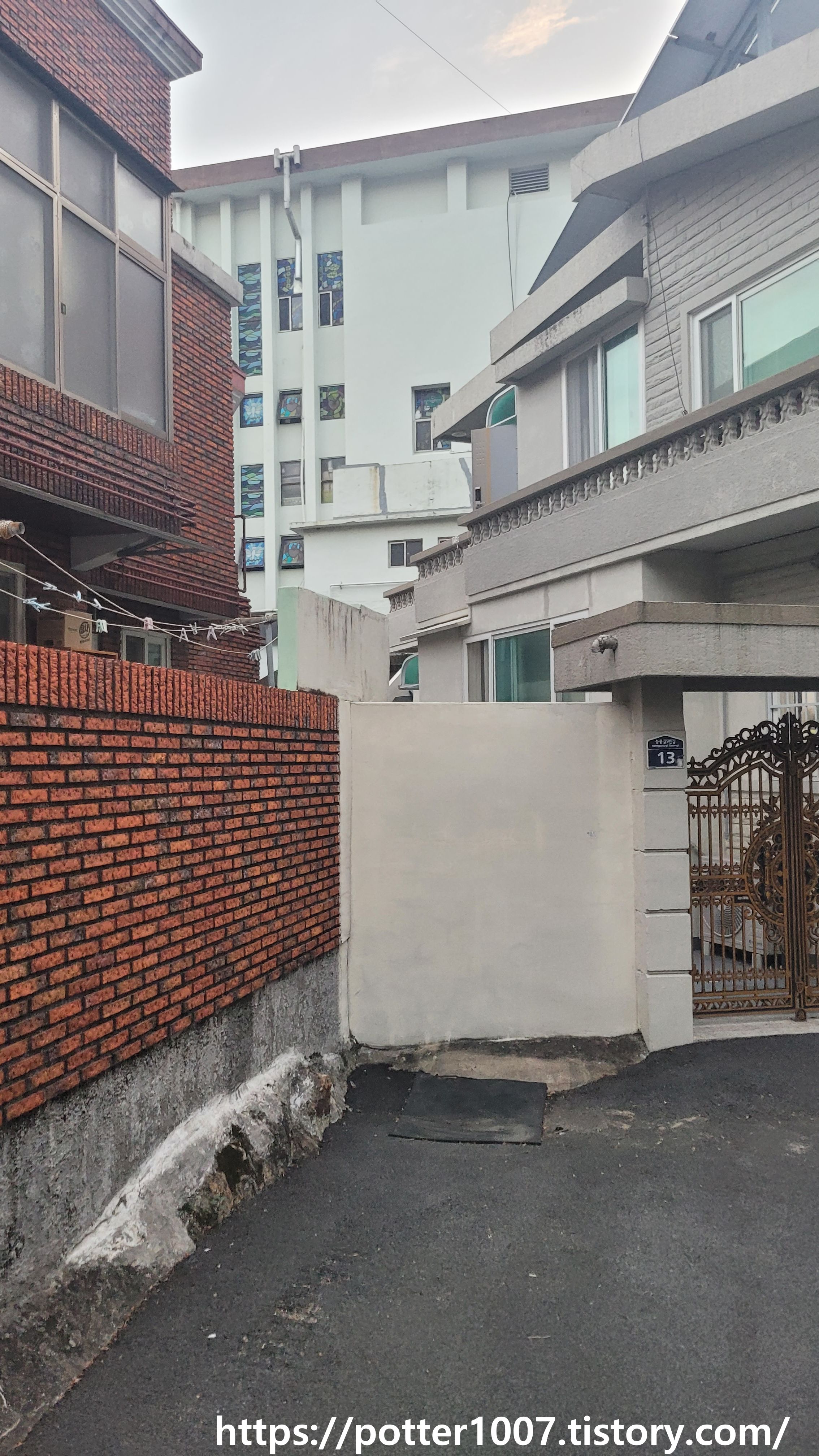 잘 보시면 능풍길 5번길 9 건물을 둘러싼 빨간벽돌 담이 보입니다. 사진에 보이는 복개부 위에는 이전에 봤던 상류방향의 담(정확하게는 옆집 화장실인듯 합니다.)이 있는 것입니다.