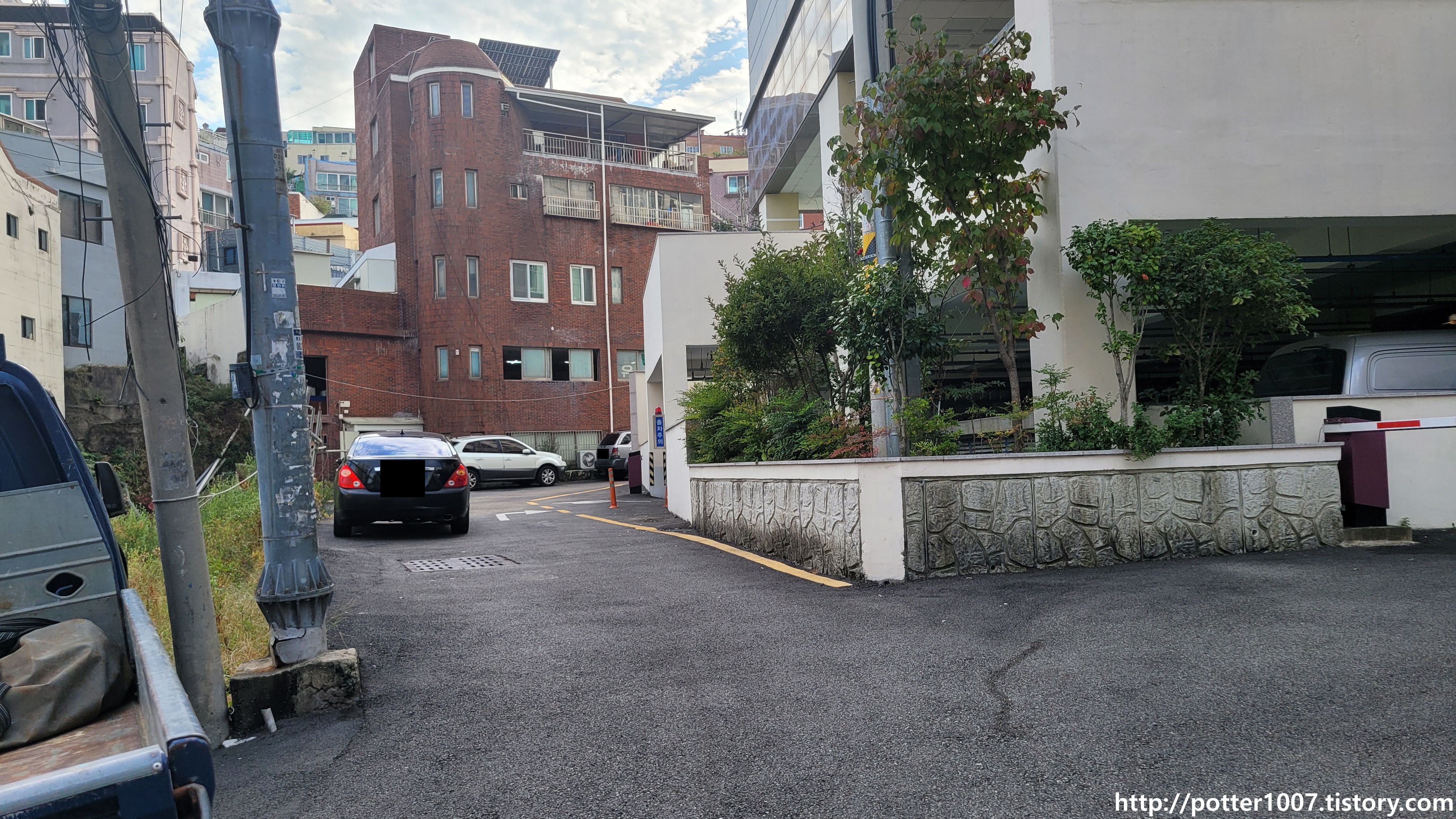 사진과 같이 가던길의 왼편에서 길이 튀어나옵니다. 가운데 하수도 빗물받이를 두고 길이 접속한듯한 모양을 하고 있습니다.