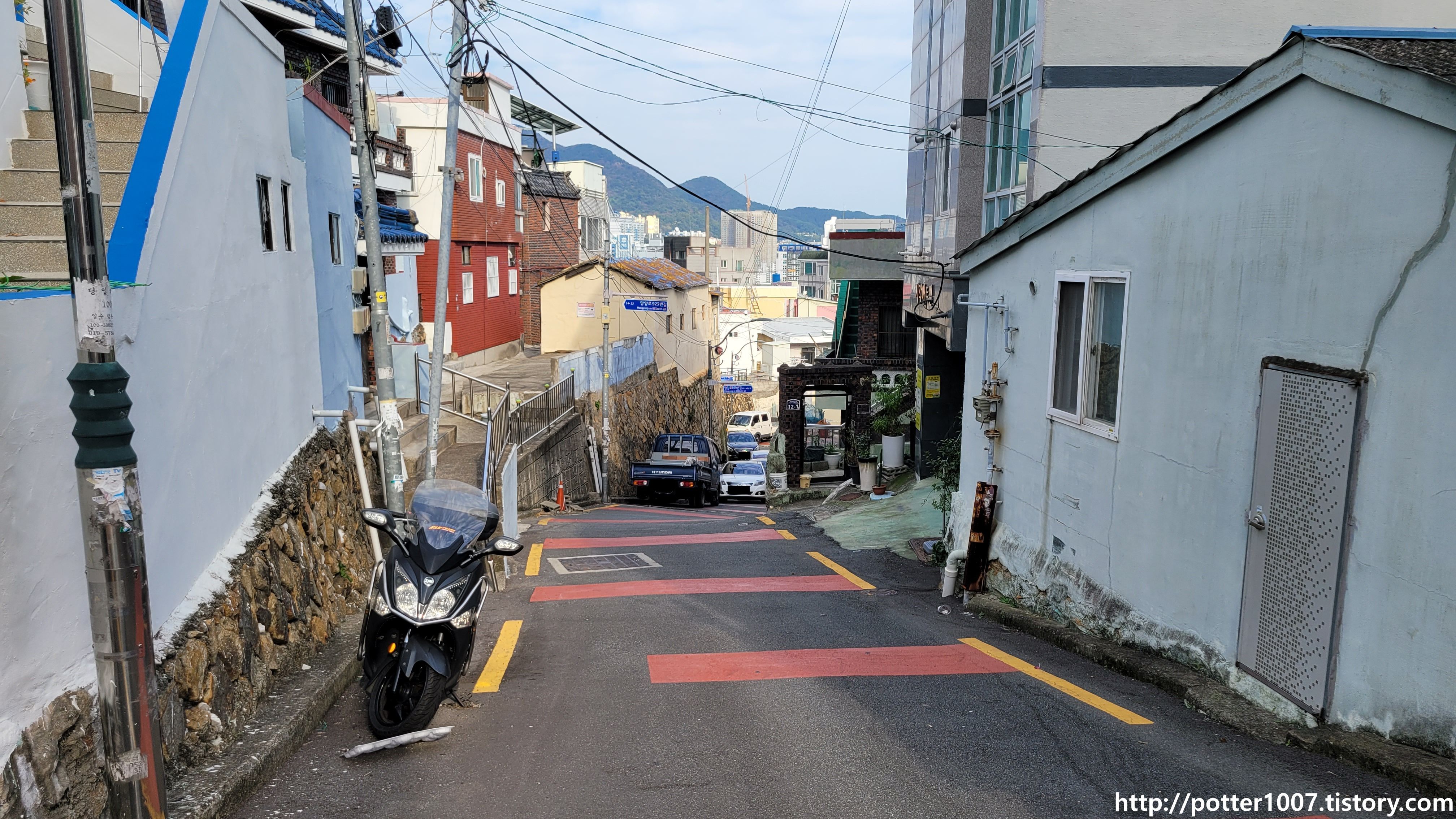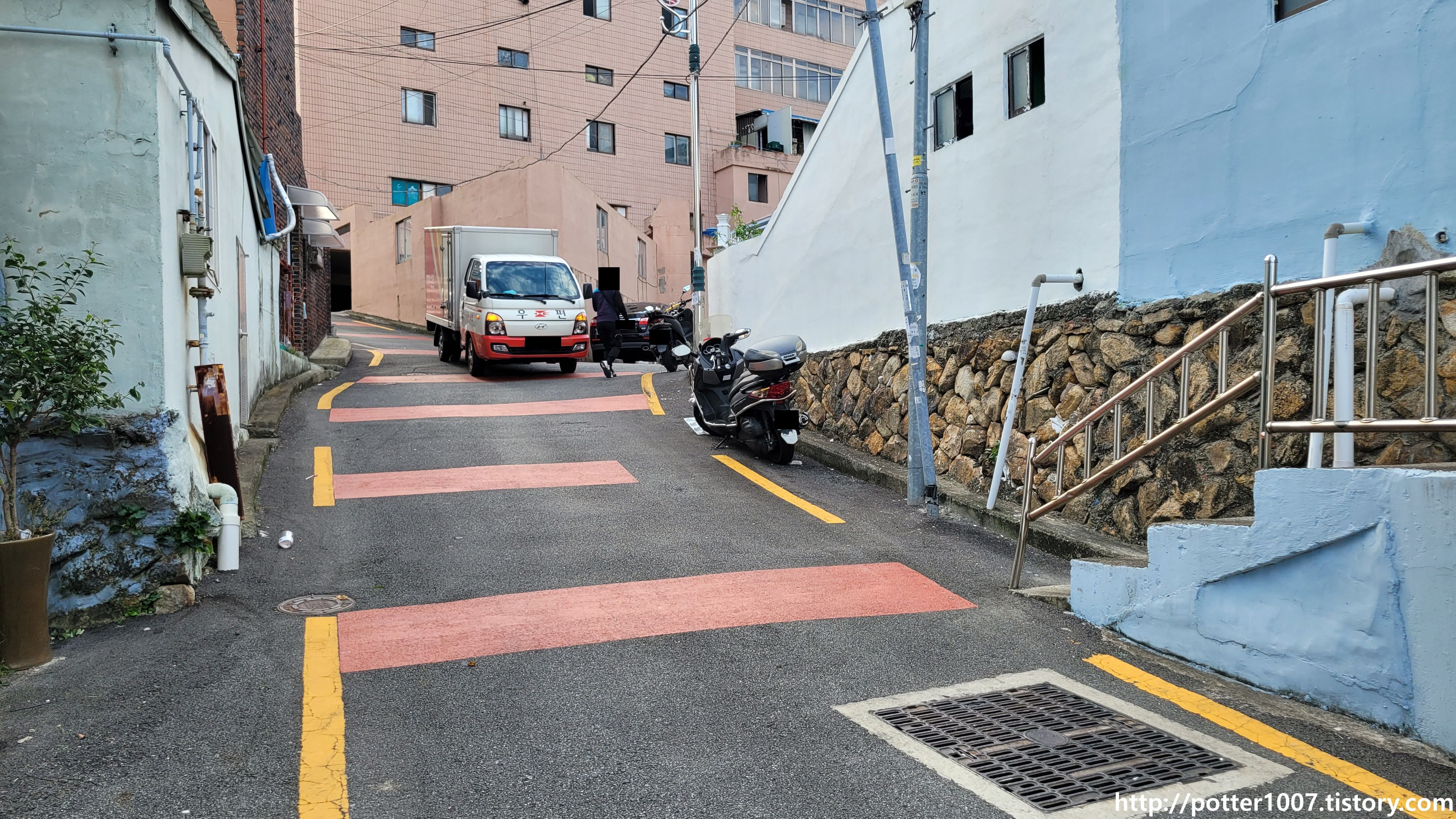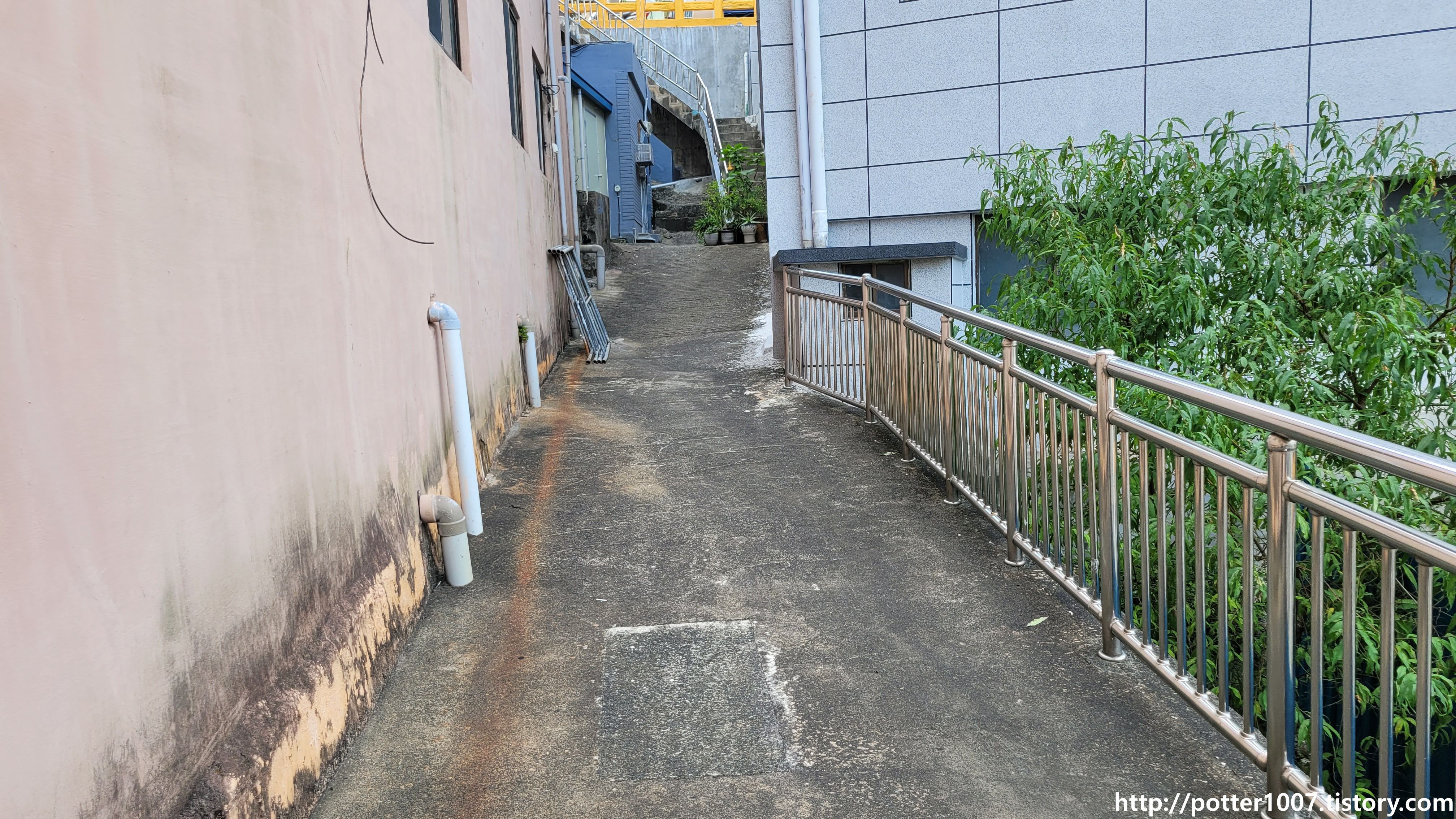 계단이 나오며 여기서 계단으로 올라가야 찻길이 나옵니다.