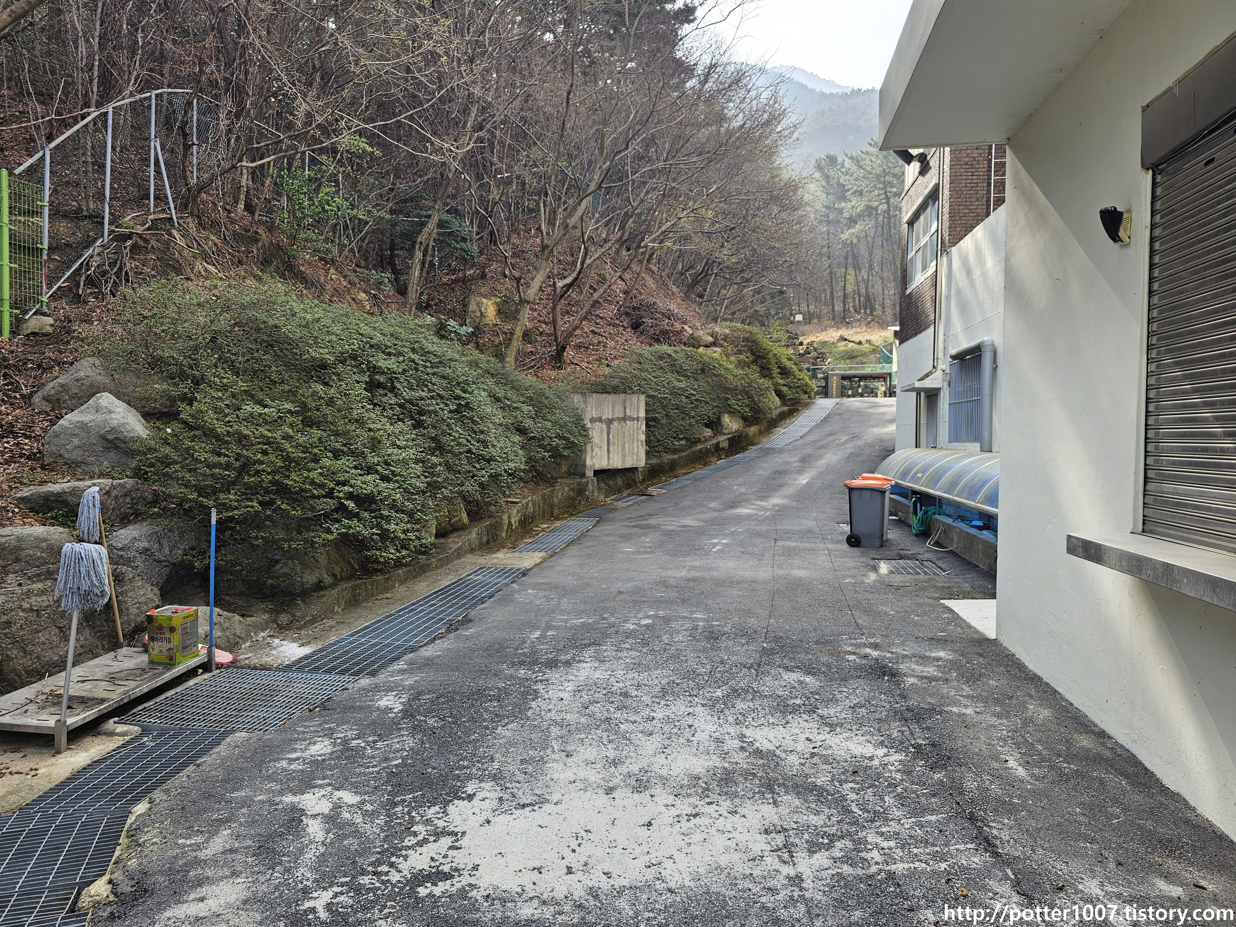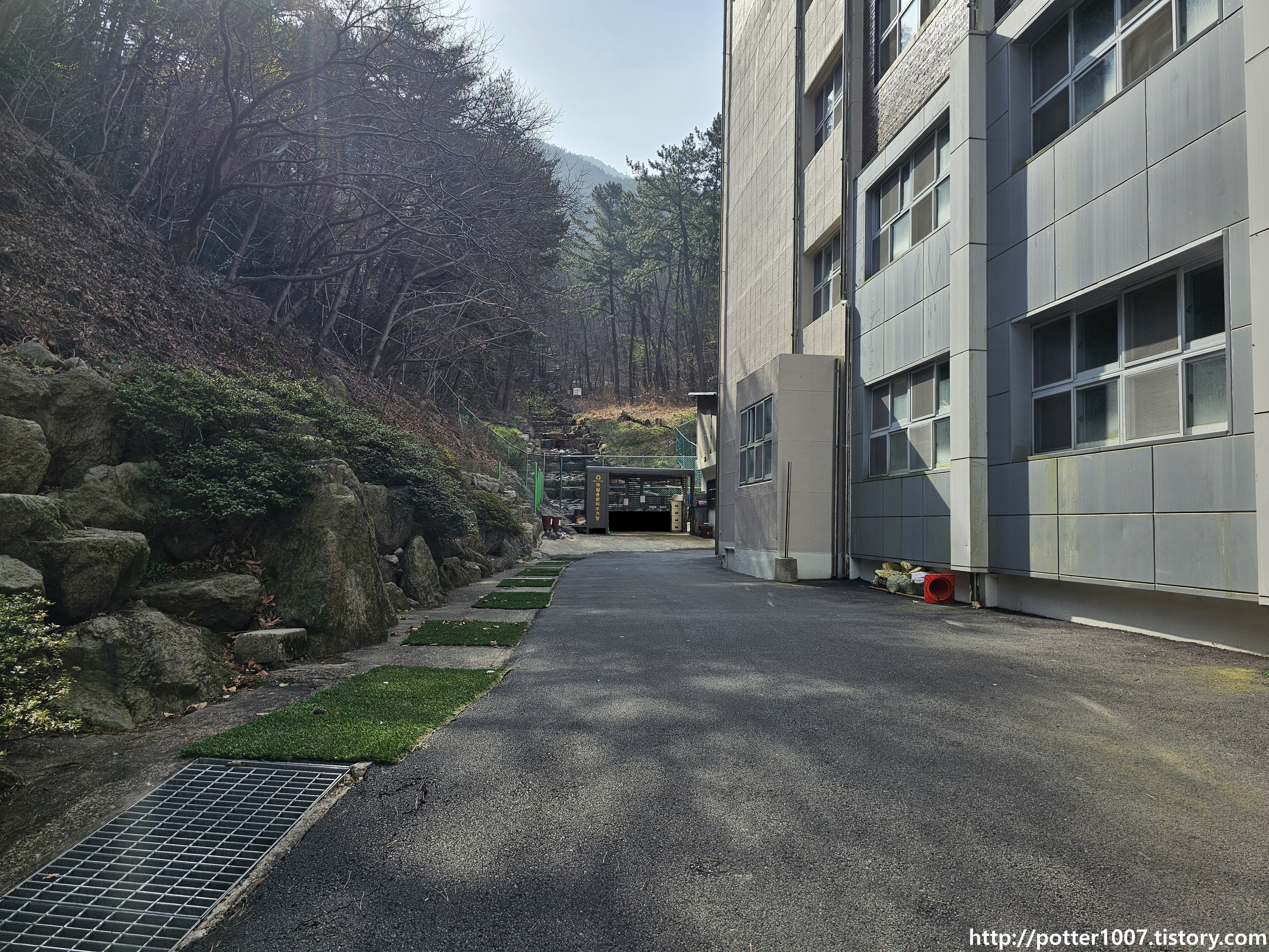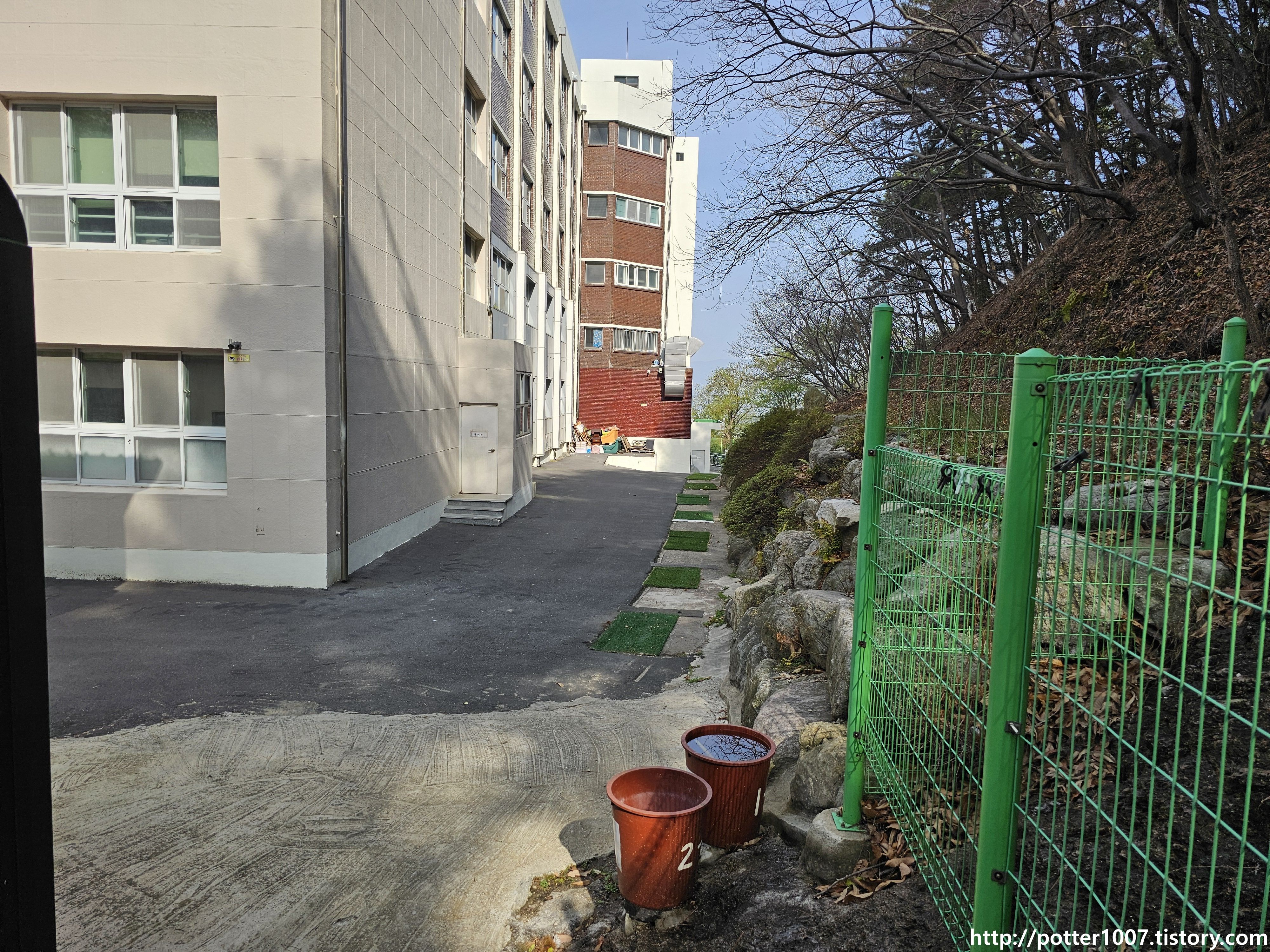 하지만 아파트의 뒷편 옹벽이 높은지라 산자락이 중학교에 바로 붙어버립니다. 사진의 공간으로 지천이 흐르는것으로 보입니다.