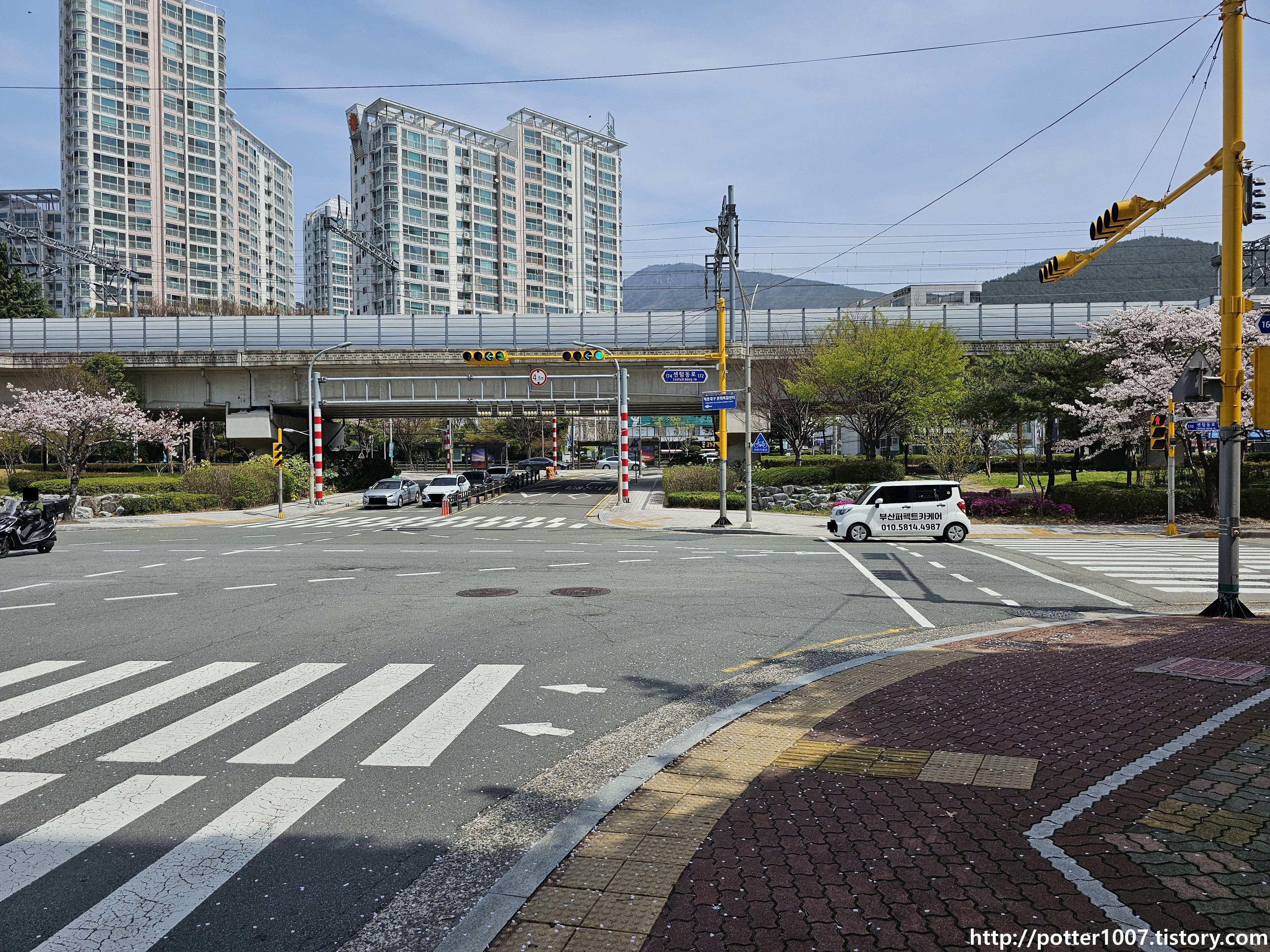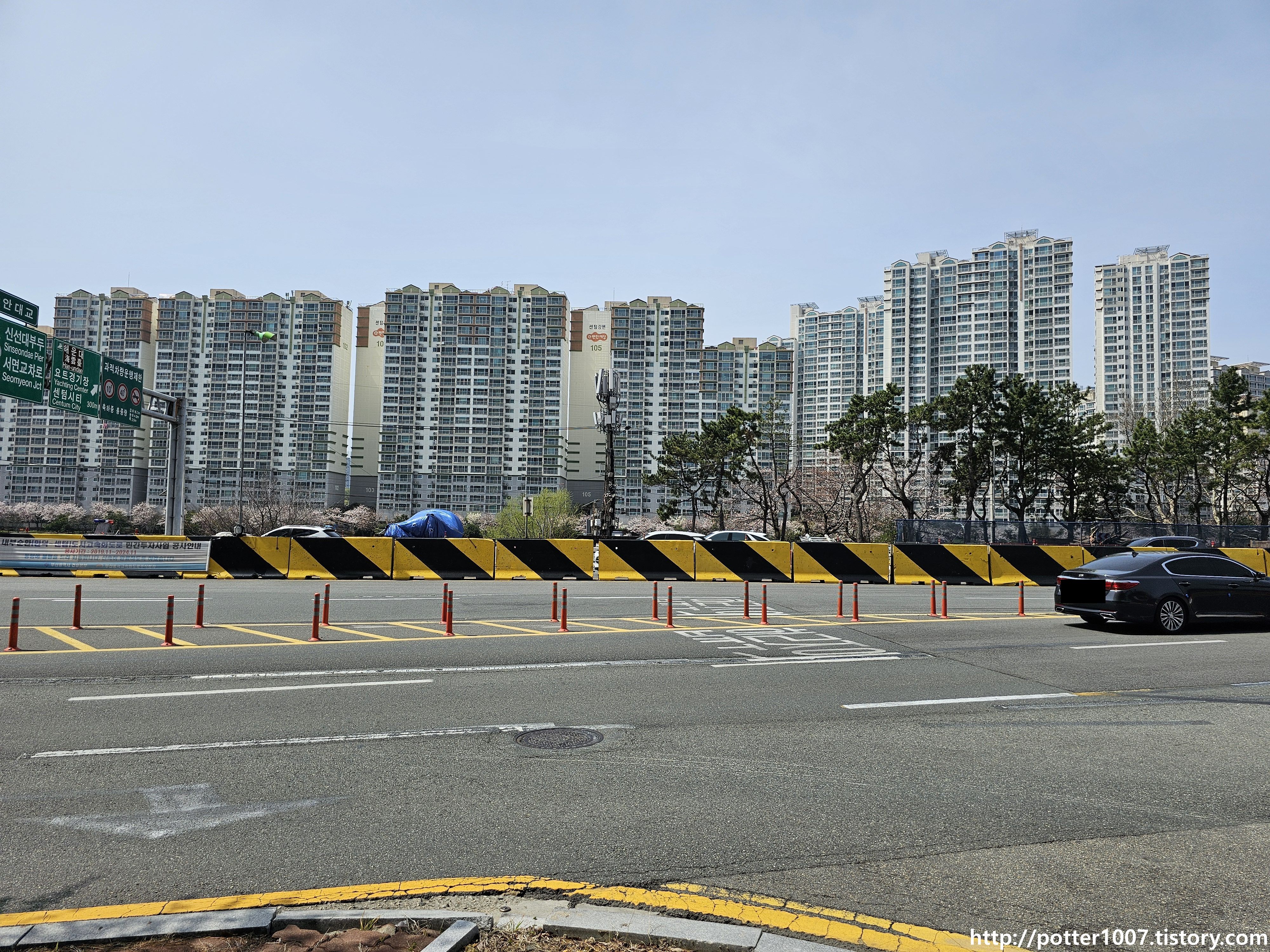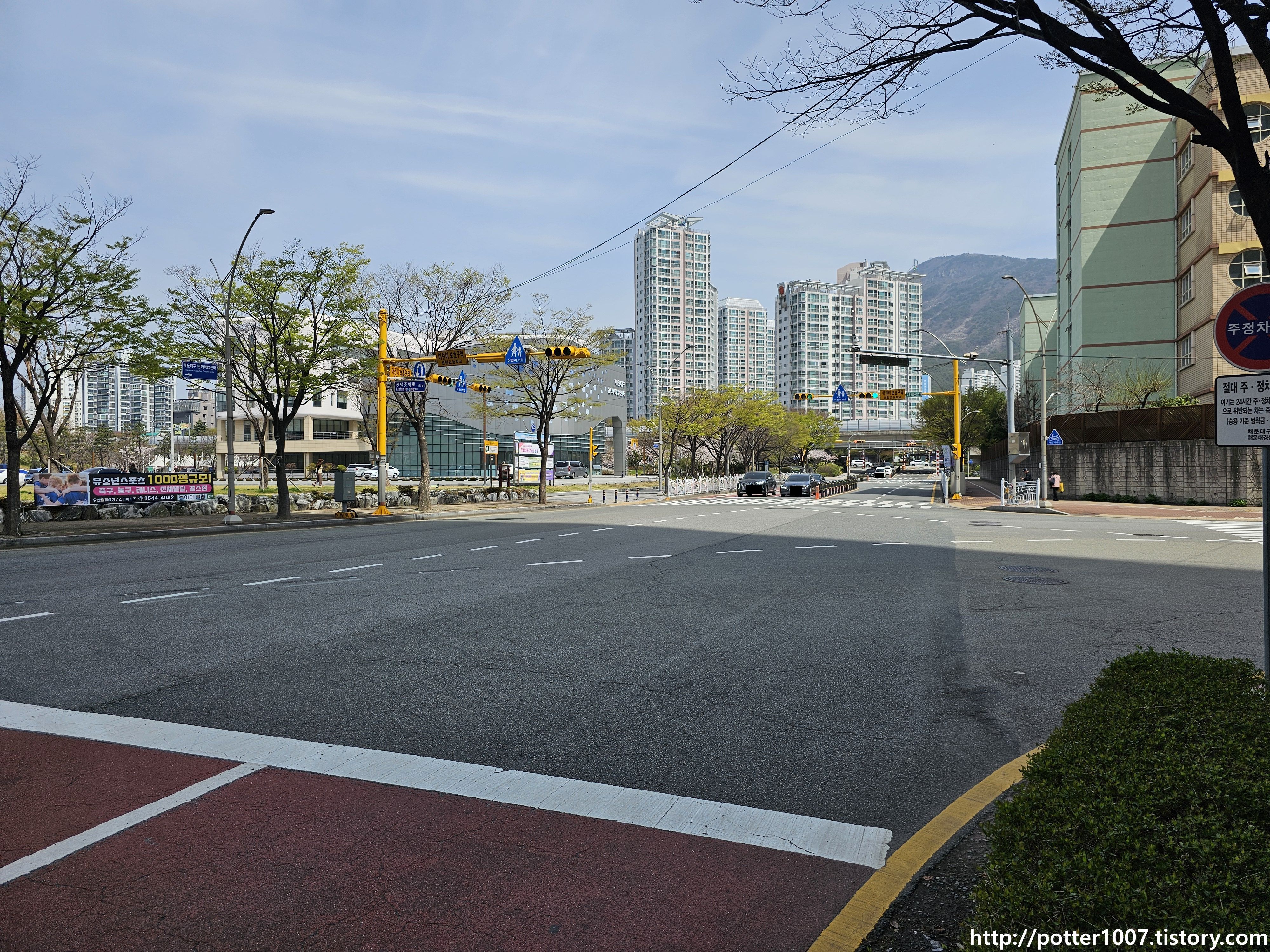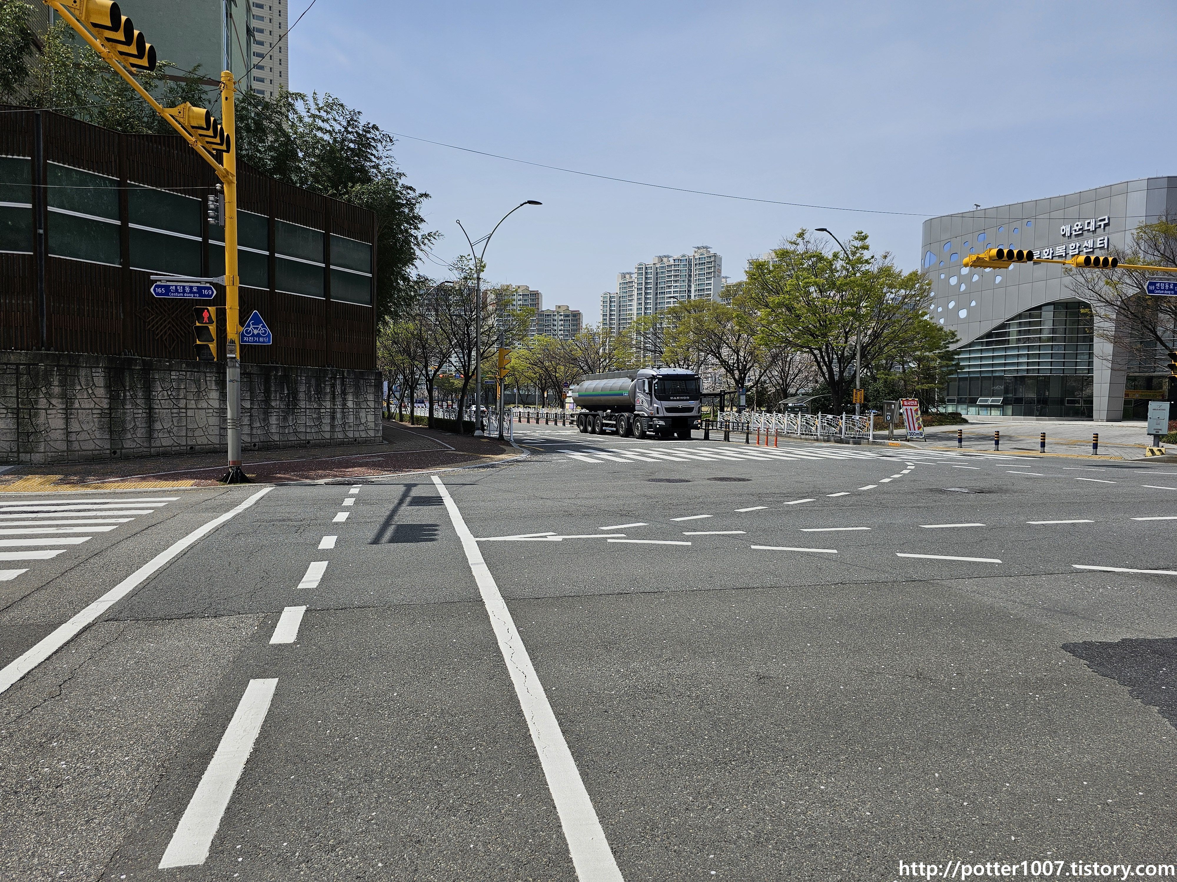 센텀중앙로와의 삼거리를 지나갑니다. 길이름 그대로 센텀시티를 남북으로 관통하는 도로입니다.