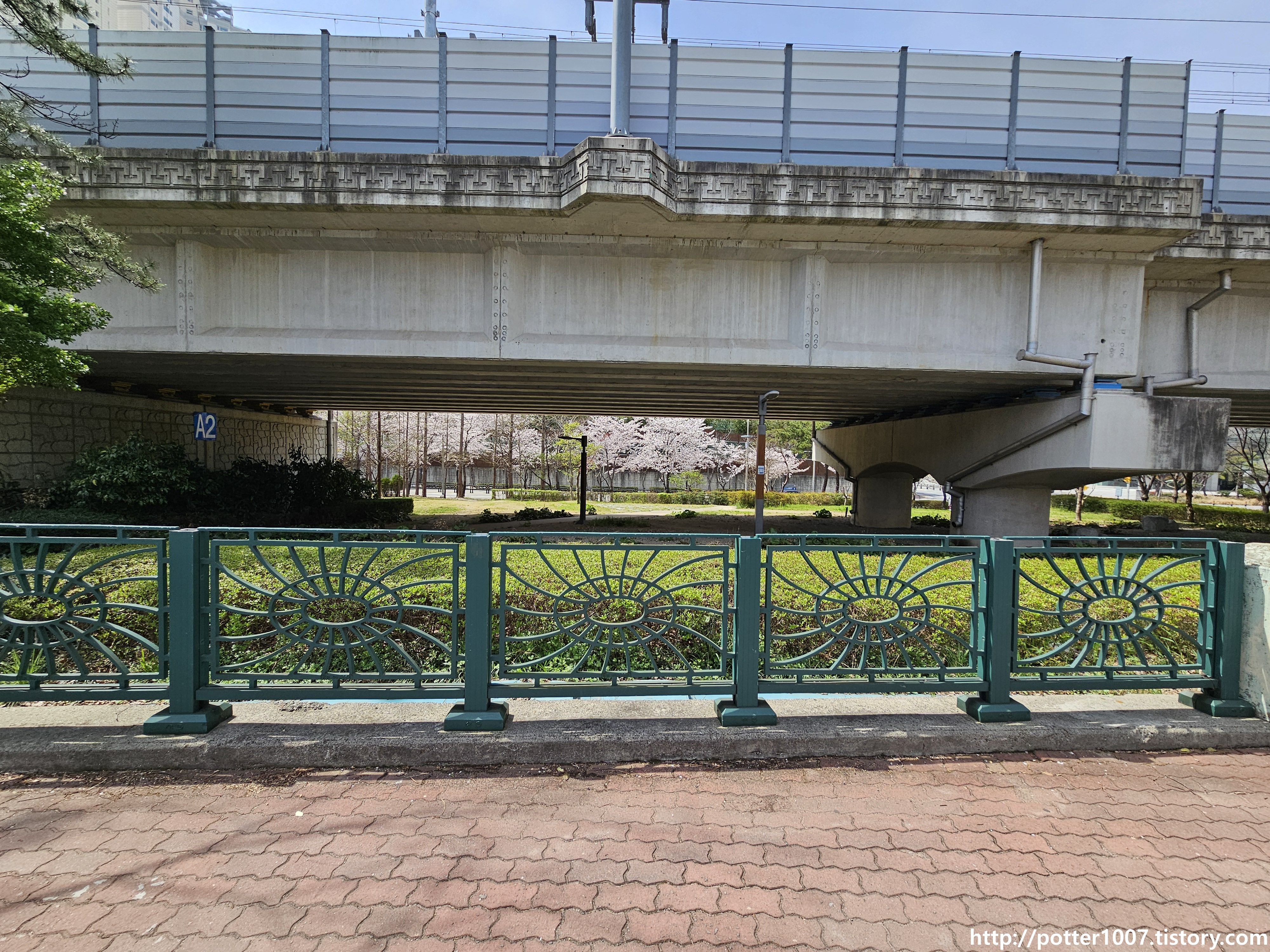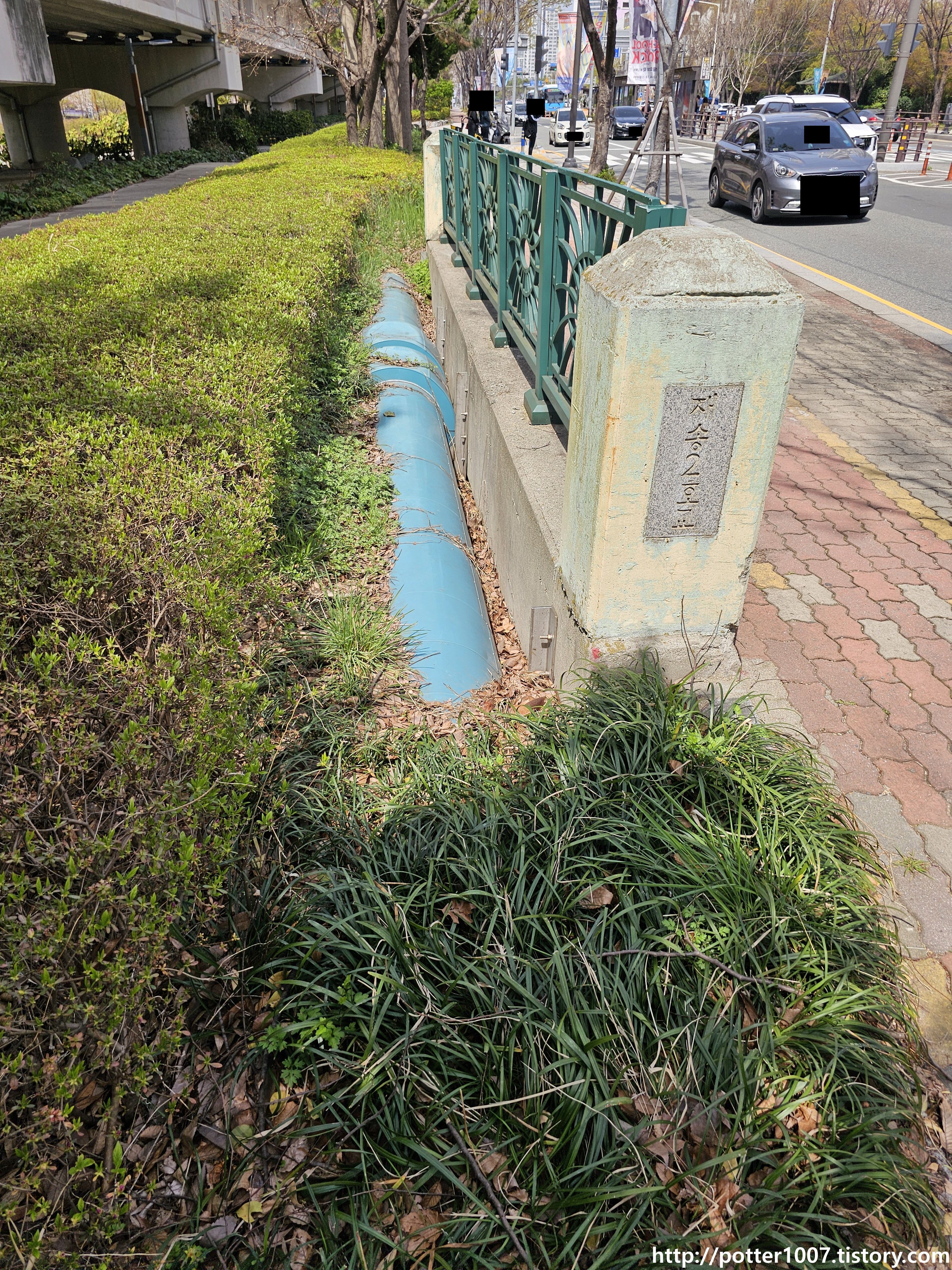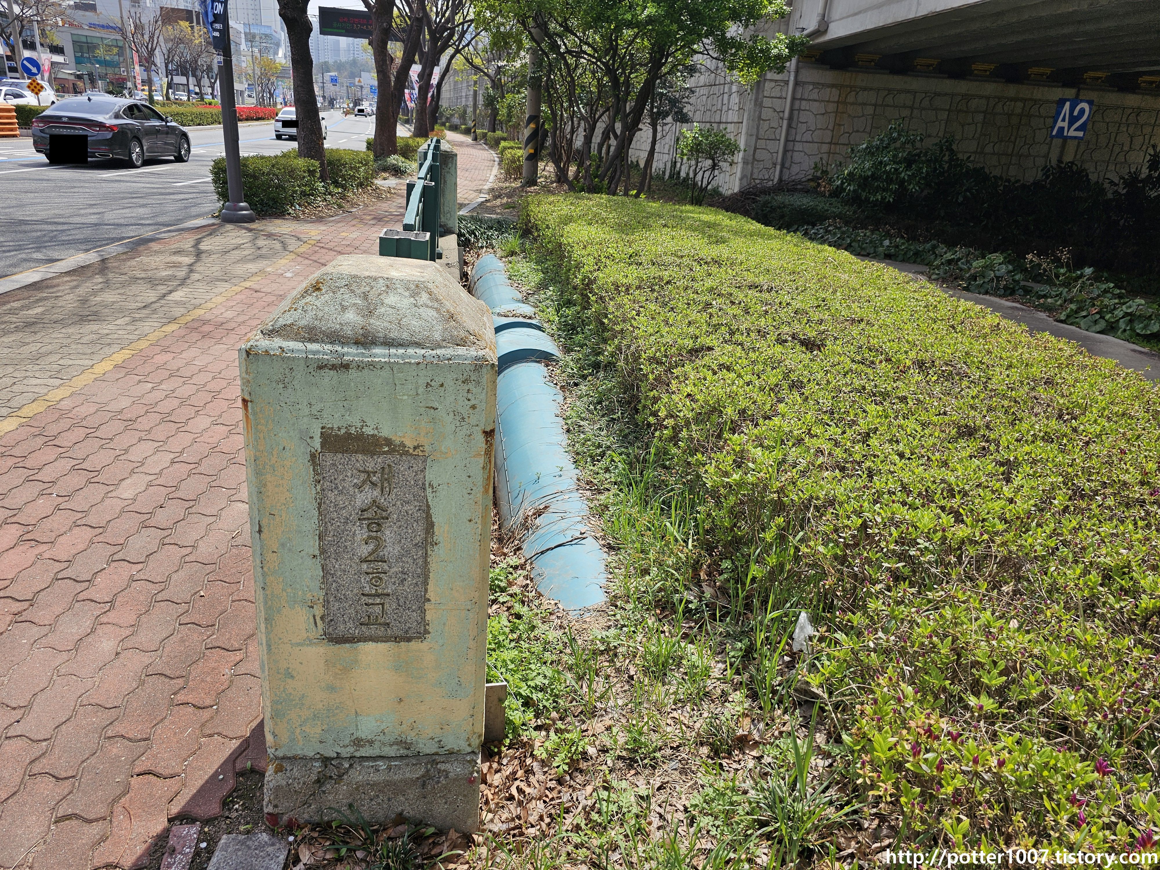 다리 이름은 재송2호교입니다. 왼편은 원래 미복개상태였는데 동해선을 복선전철화하면서 복개되었습니다. 다리옆 상수도관이 여전히 매달려있네요.