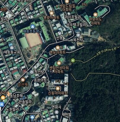현재의 모습입니다. 재송초등학교와 신동아아파트 사이에는 명유아파트, 센텀안성타워아파트 그리고 약간의 주택들이 포진해있습니다.