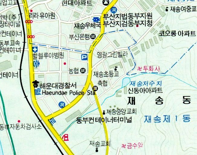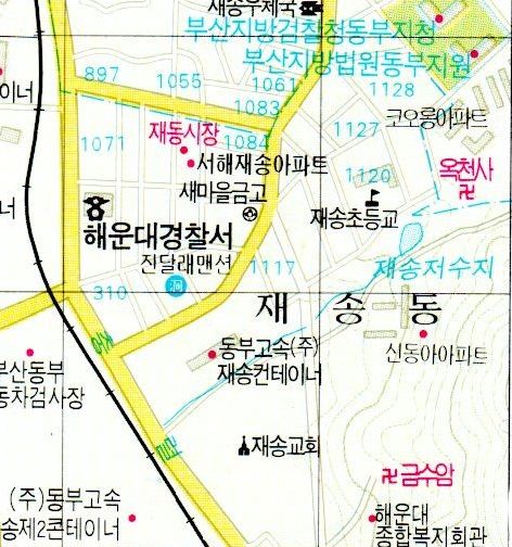 20년은 넘은 지도에서 표시된 재송저수지의 모습입니다. 위치를 보면 신동아아파트와 재송초등학교 사이에 있는것으로 표현됩니다.