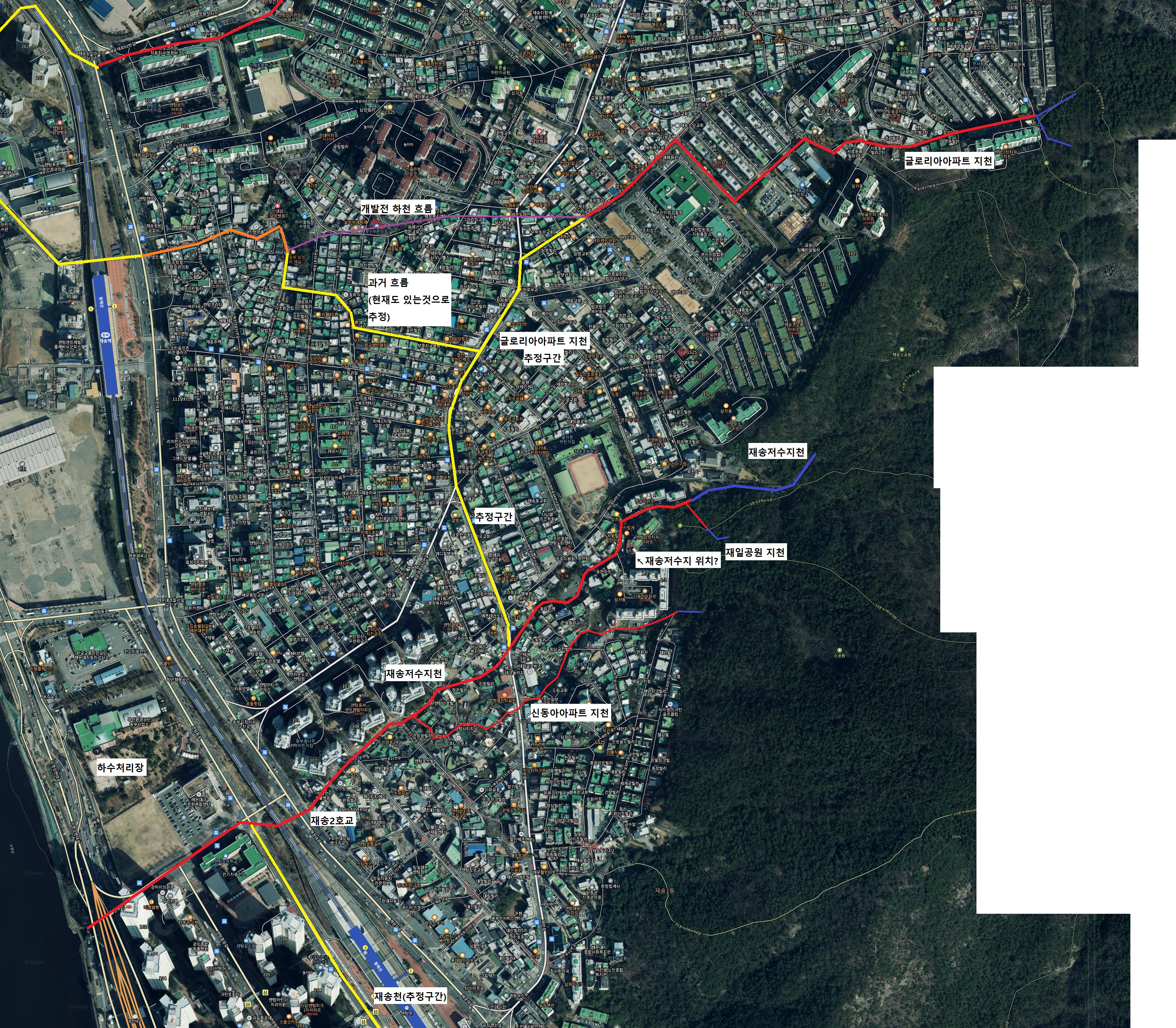 이 하천은 위쪽에 있는 반여천(?), 재반천(?)과 동일하게 장산에서 발원하여 수영강으로 흘러드는 하천입니다. 반여천 답사기 1편에서도 설명했듯이 여러 하천들이 유로가 변경되는 바람에 원래 재반천의 지천인 센텀글로라아아파트 지천이 제송저수지천의 지천이 되었지만, 본류 자체는 다행히 선형이 거의 바뀌지 않았습니다.
