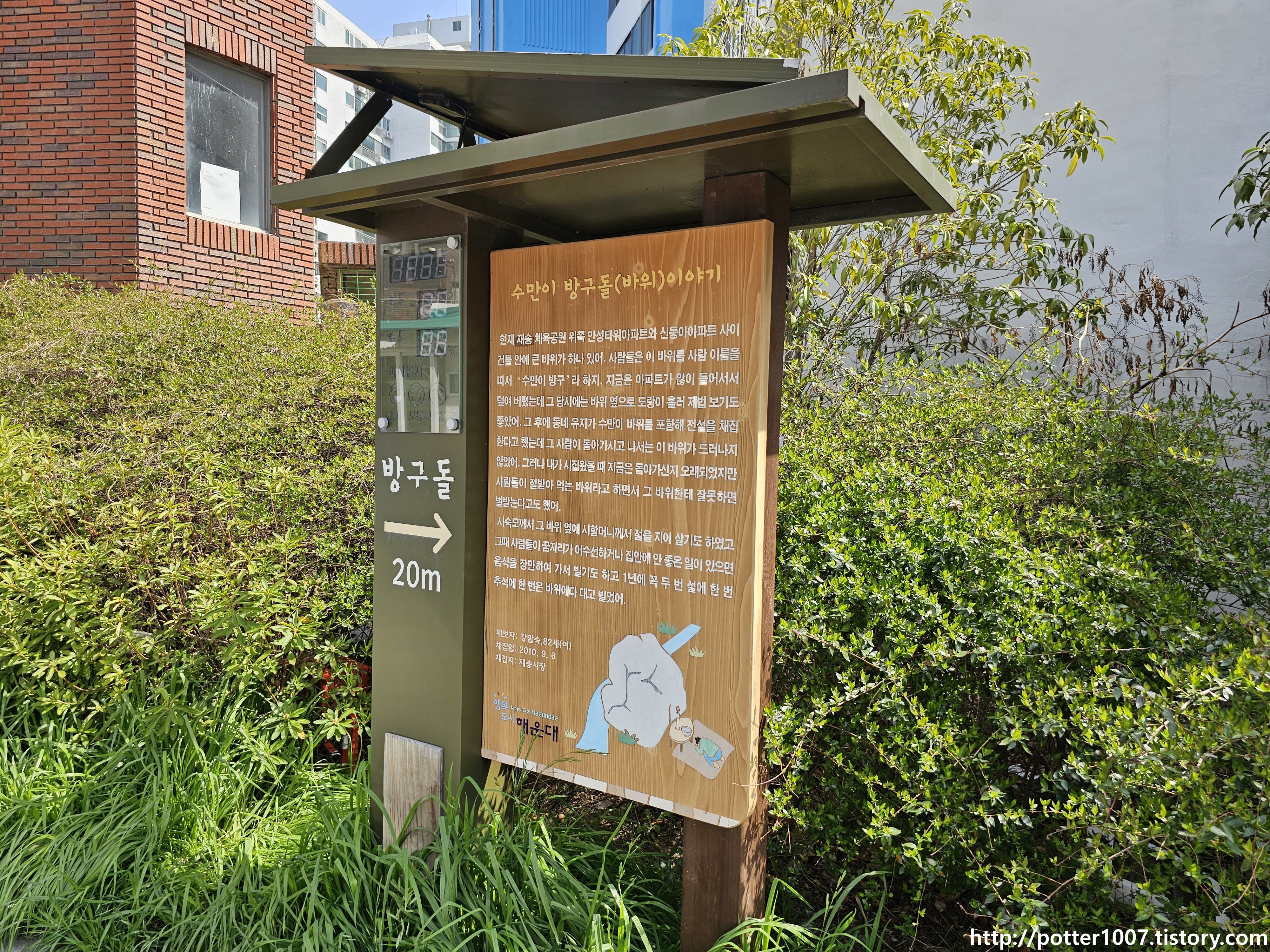 이 아파트의 옹벽에는 큰 바위가 박혀있는데, 수만이방구(바위)라고 부른다고 합니다. 설명문을 보면 도랑(재송저수지천)이 언급됩니다.