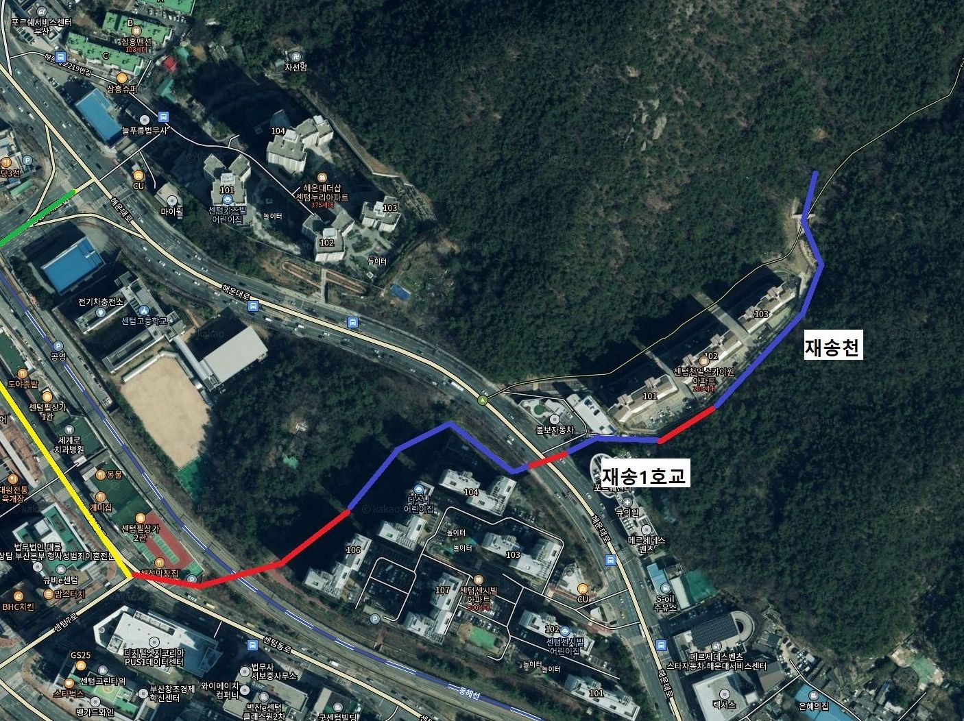이번에 답사기를 쓸 하천은 부산 해운대구에 있는 재송천입니다.