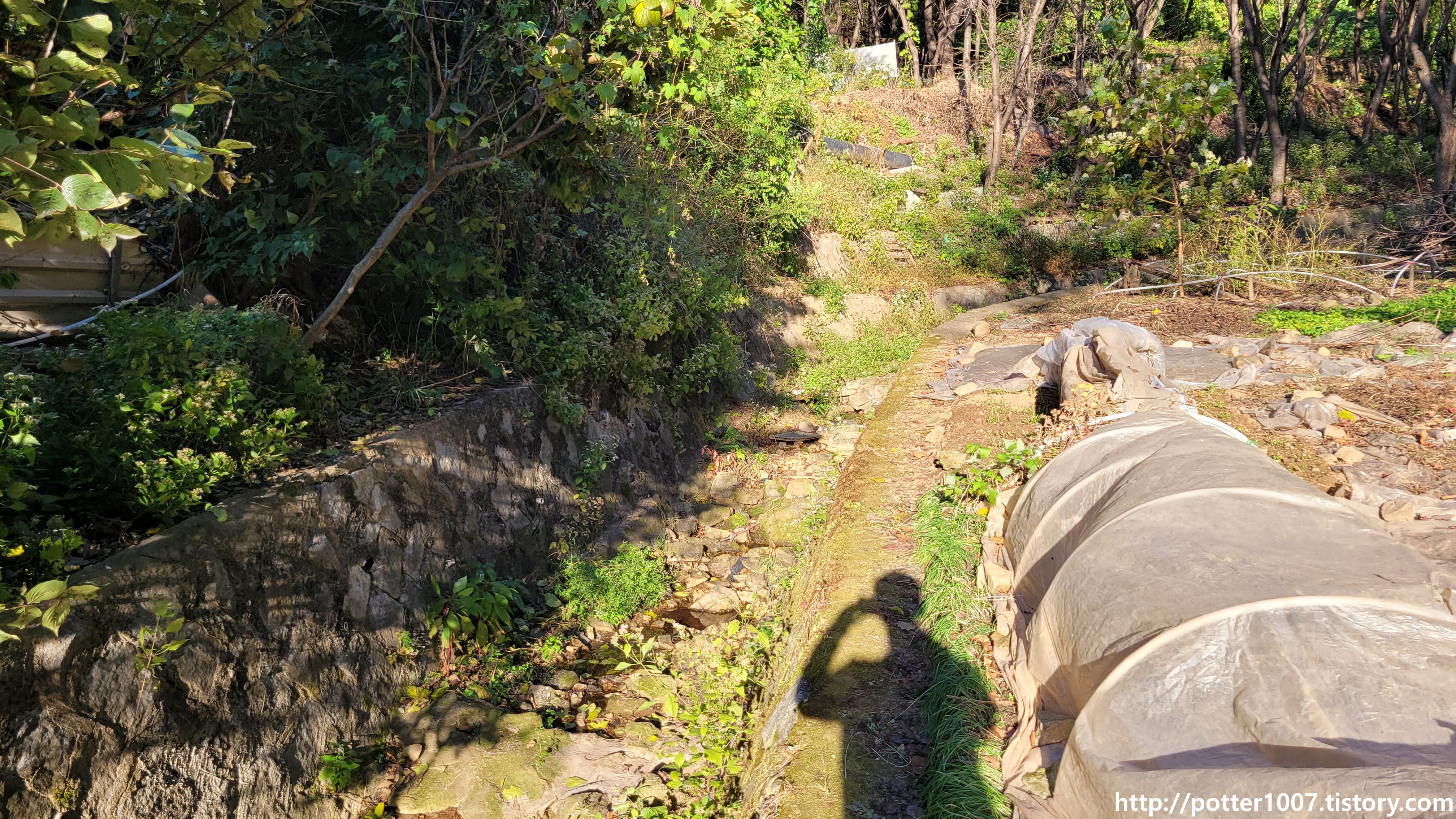 원래 사방댐은 상류에서 내려오는 돌이나 모래를 막아주기 위한 것이기 때문에, 이렇게 사방댐 뒷편에 흙이 차있으면 안됩니다. 지어진지 오래되다 보니 사방댐의 기능을 상실했습니다.