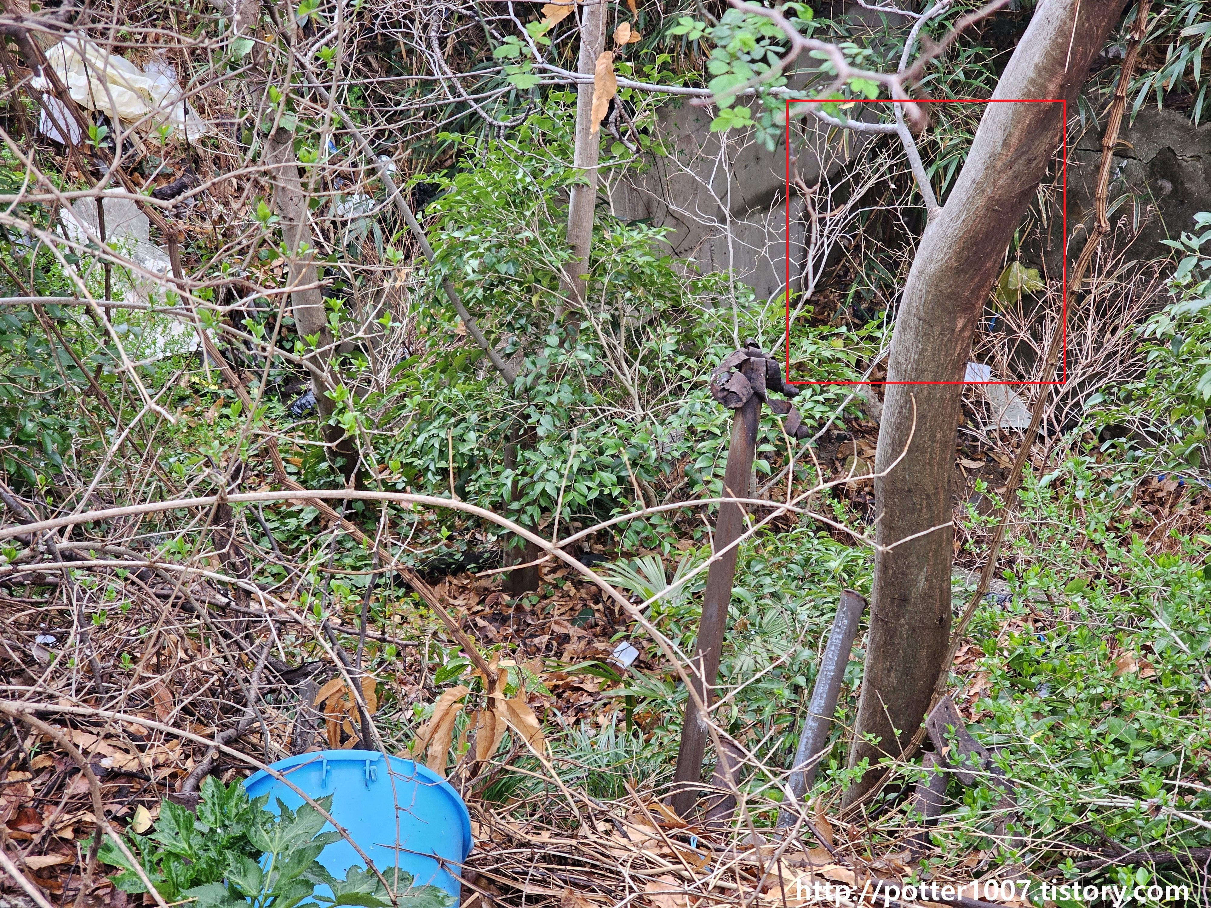 문제는 주변 환경이 답사하기에 썩 좋지 않은데, 일단 나무와 풀둘이 하천 주변으로 너무 많이 자라있고, 상류방향 기준 오른쪽 길은 올라가기도 버거운 샛길이고, 왼편은 하천에서 조금 떨어져 있습니다. 이게 그나마 찍은 박스 하류방향 모습입니다. 빨간 사각형 안에 있습니다. 다른 각도로는 찍기가 어려웠습니다.