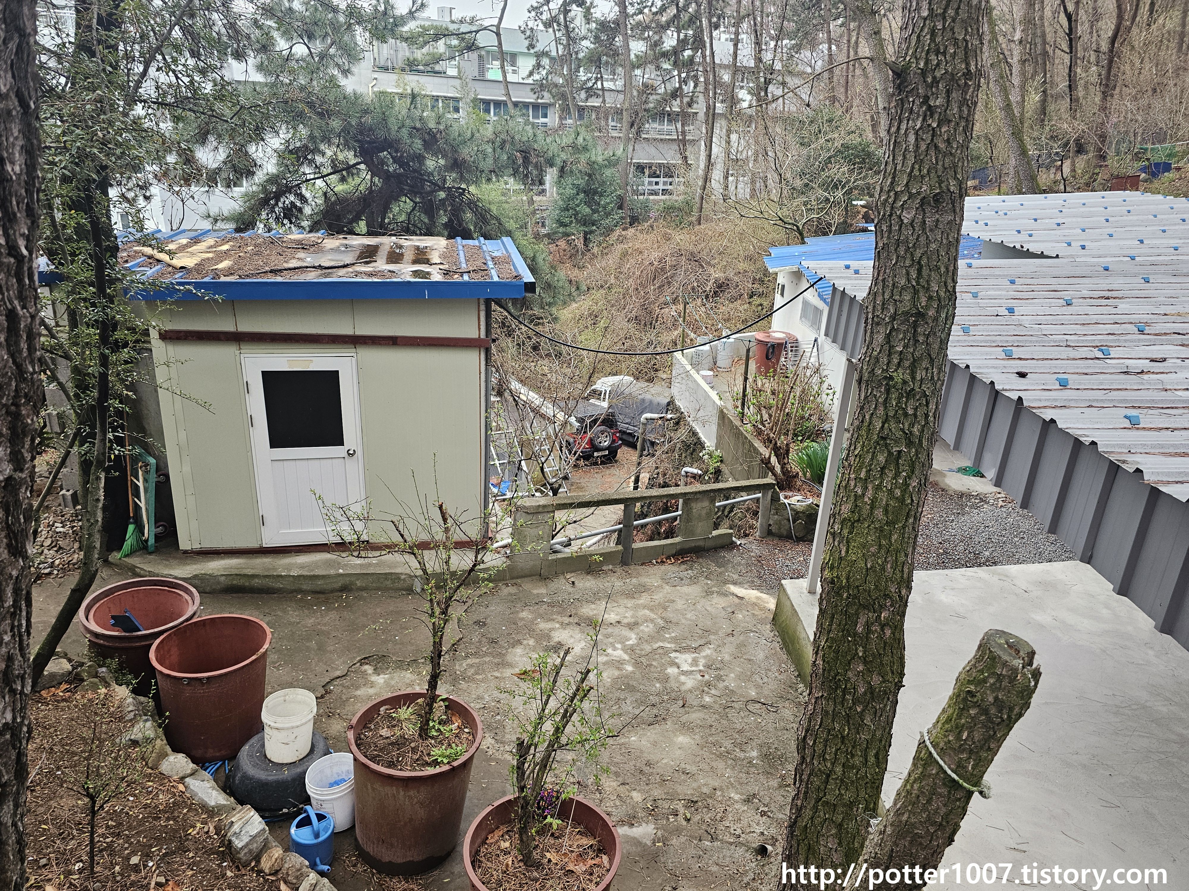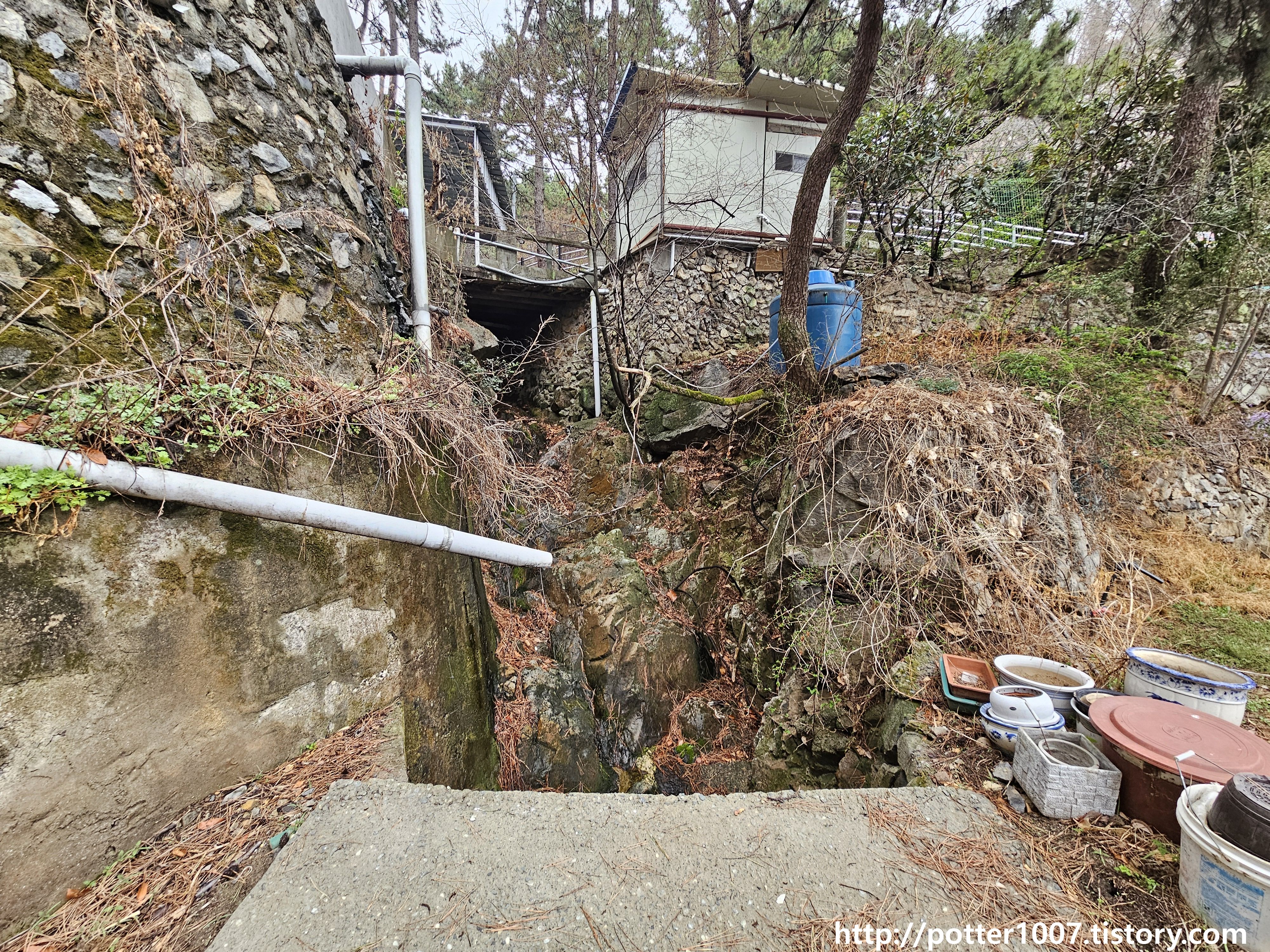 더 위로 가려면 올라가는 길을 따라 계속 올라가야 합니다. 길에서 바라본 하류방향 모습인데, 사유지 마당앞을 지나서 하천이 박스로 들어가는 지점이 가려졌습니다. 저 집 안으로 들어가면 자세히 볼수 있을텐데 인기척이 없어서 양해를 구하기가 어려웠습니다.