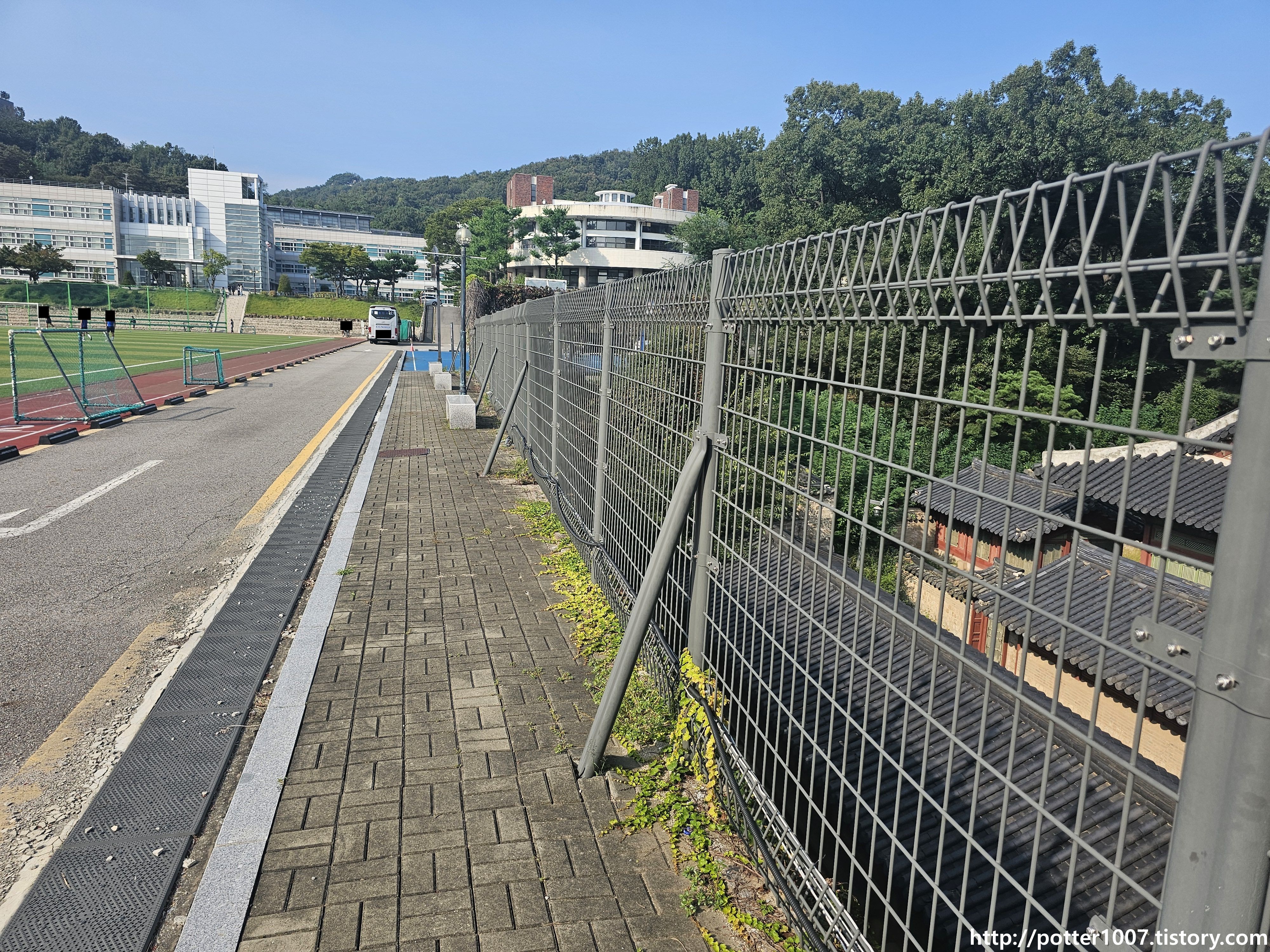 중앙중학교의 동쪽 귀퉁이를 따라 계속 올라가면 드디어 신선원전 구역과 접하는 곳이 나옵니다. 신선원전 구역은 관람이 안되므로 중앙중고 쪽에서 보는것이 거의 유일한 방법이라 할수 있는데, 바로 이곳 앞으로 신선원전 서쪽지천이 지나가는 것입니다.