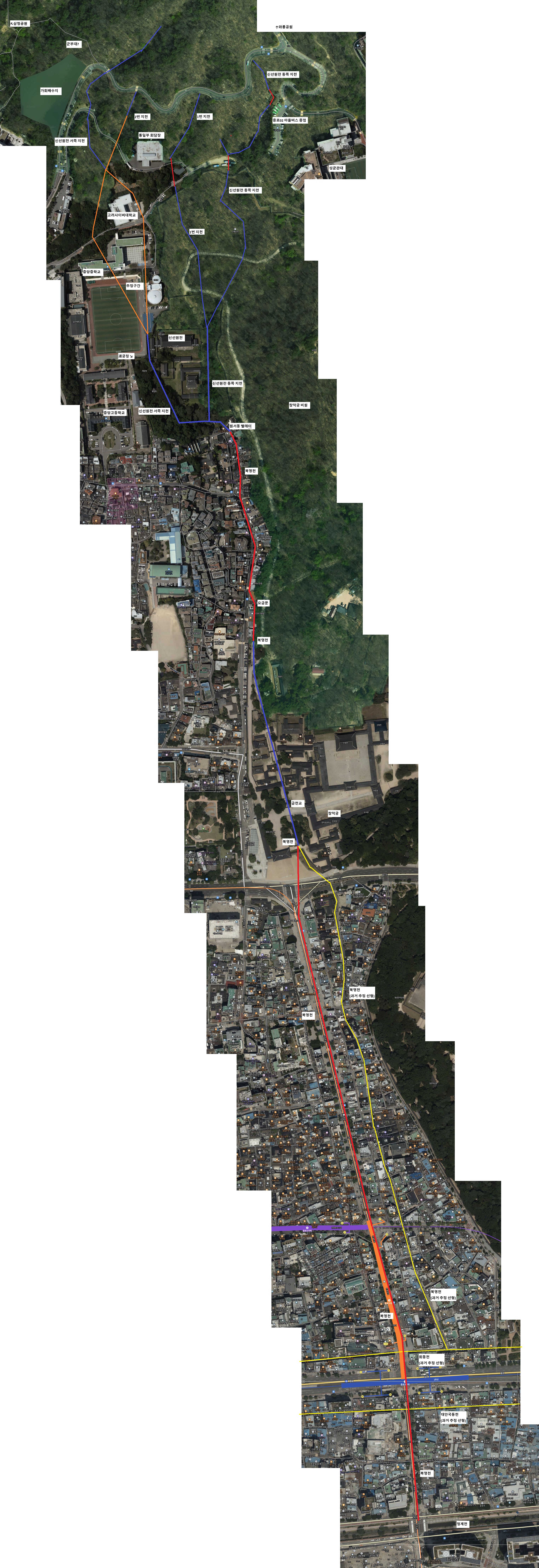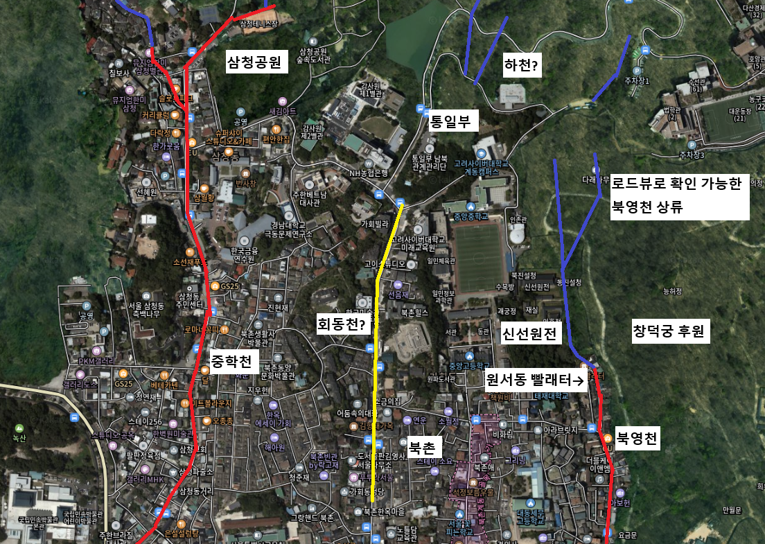 위 주절거린 내용을 지도로 설명하면 위와 같습니다. 중학천과 북영천 사이 샌드위치로 껴있는 회동천(북촌로)의 상류가 통일부를 지나는 하천일 가능성이 생기게 됩니다.