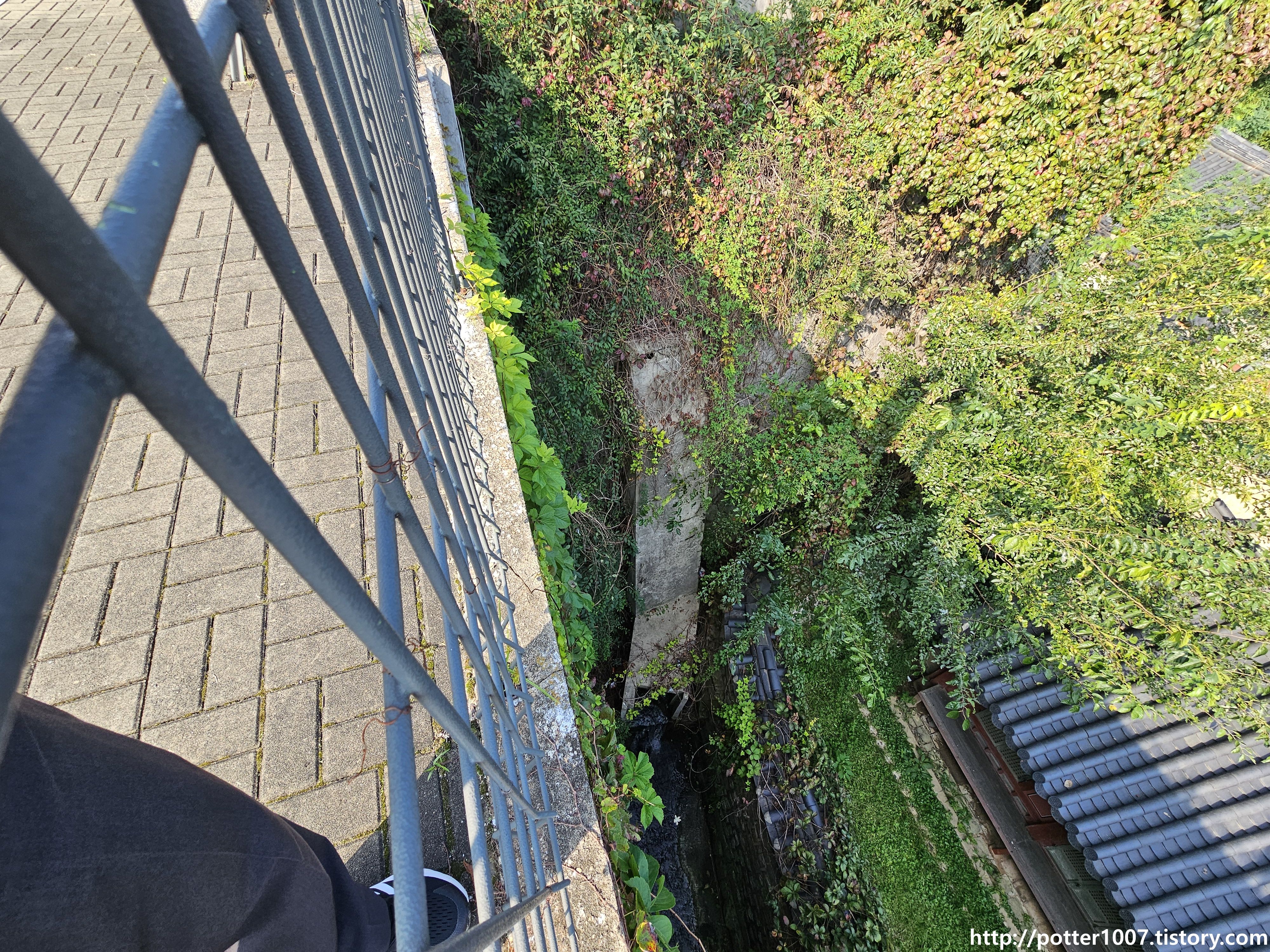 이런 식으로 넘어가며, 중앙중학교 옹벽이 거의 수직에 가까운 옹벽인데 궁 담장도 가까이에 있어 상당히 좁은 구간을 흐르는 셈이 됩니다.