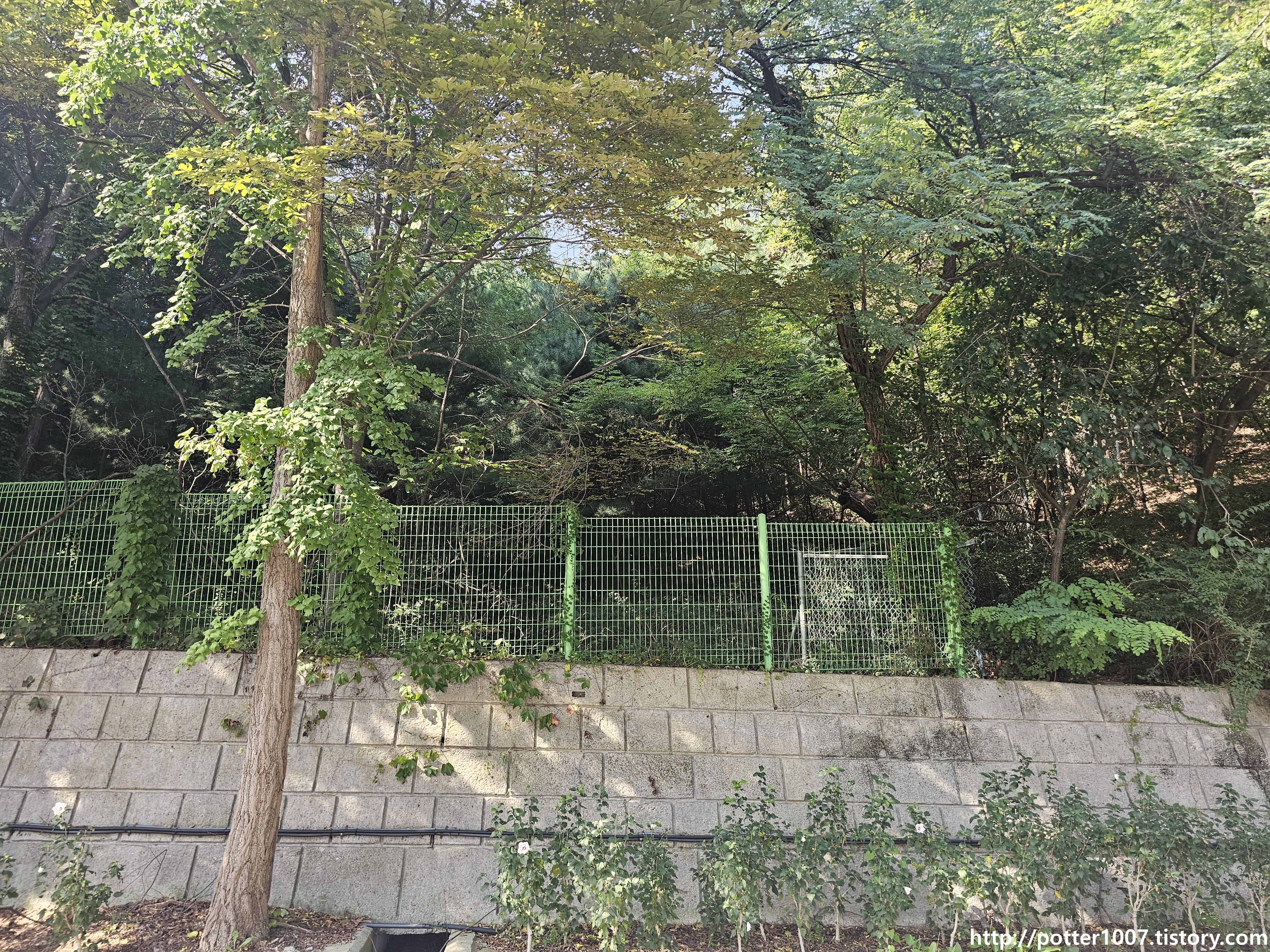 그 지점에서 상류방향을 보면, 비록 옹벽이 서있으나 산자락이 낮아지는듯한 모습이 보입니다. 아래쪽에는 배수구도 있구요.