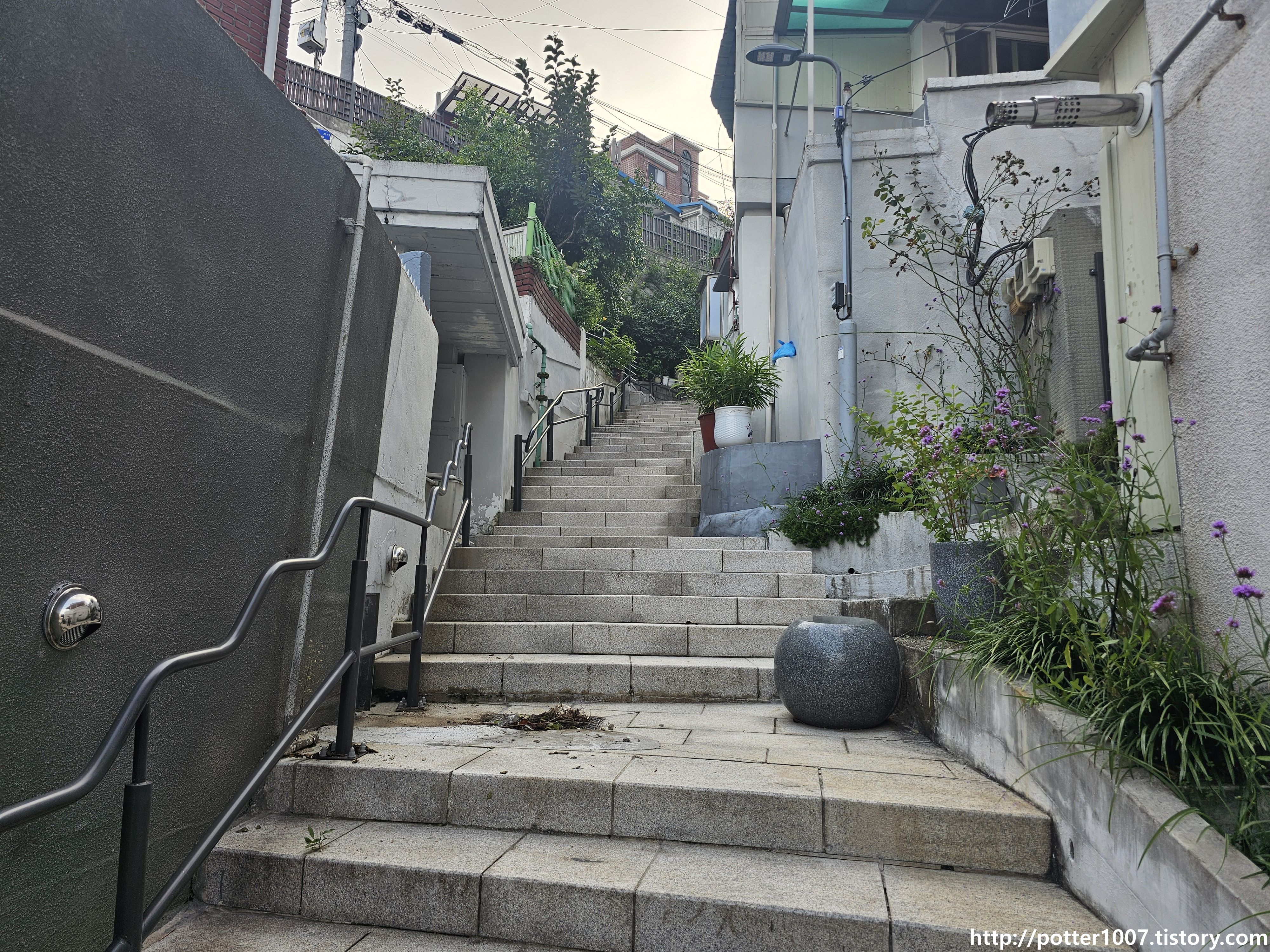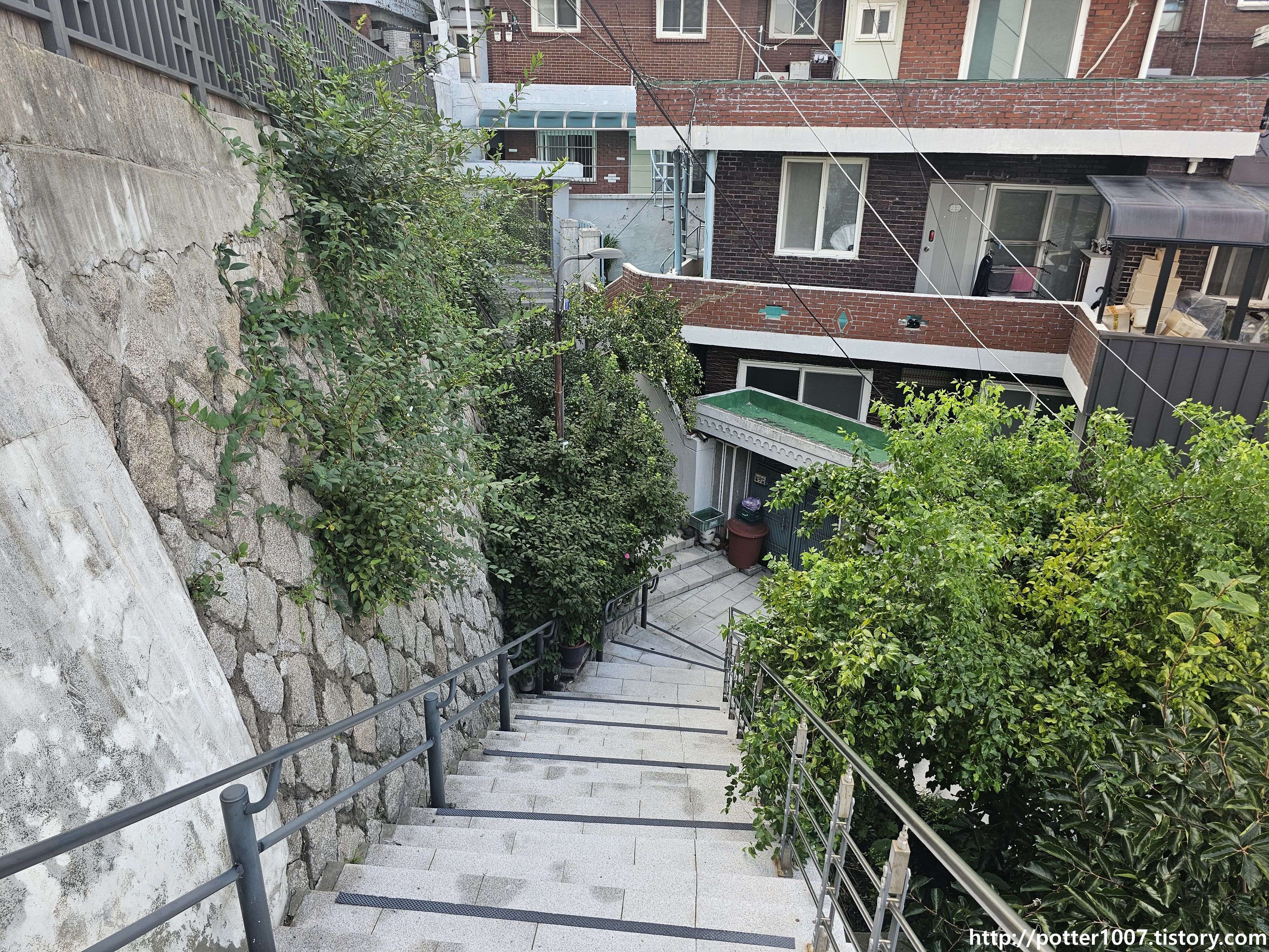계단은 비교적 고급지게 화강암석재를 사용했습니다. 나름 성곽마을이라고 비슷한 소재를 쓴 모양입니다.