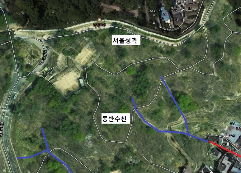 왜냐면 이 위쪽에는 테니스장이 있고, 그 위에는 와룡공원로와 붙은 화장실이 있으며, 와룡공원로가 서울성곽 아래를 지나는 지점이기 때문입니다.