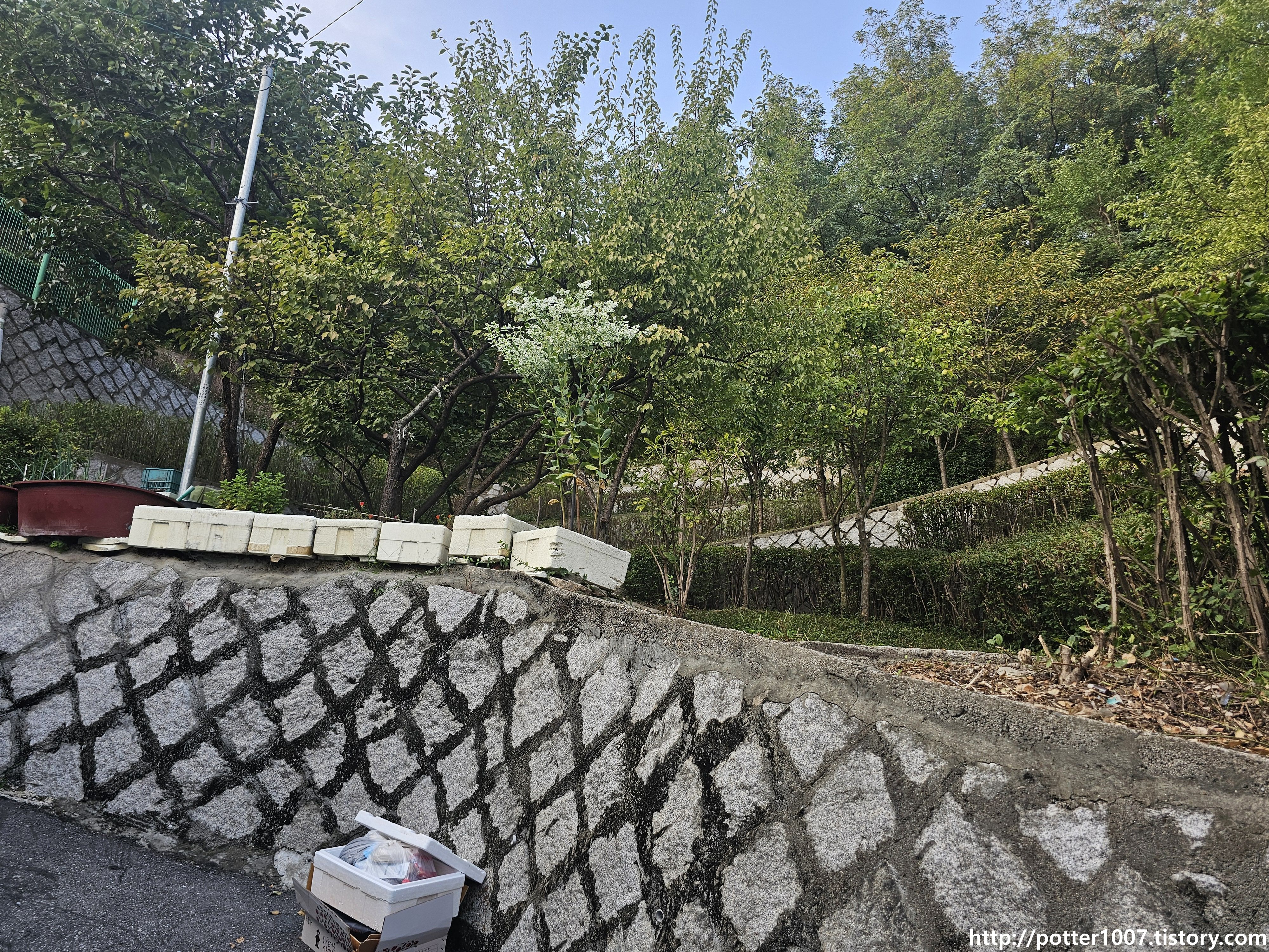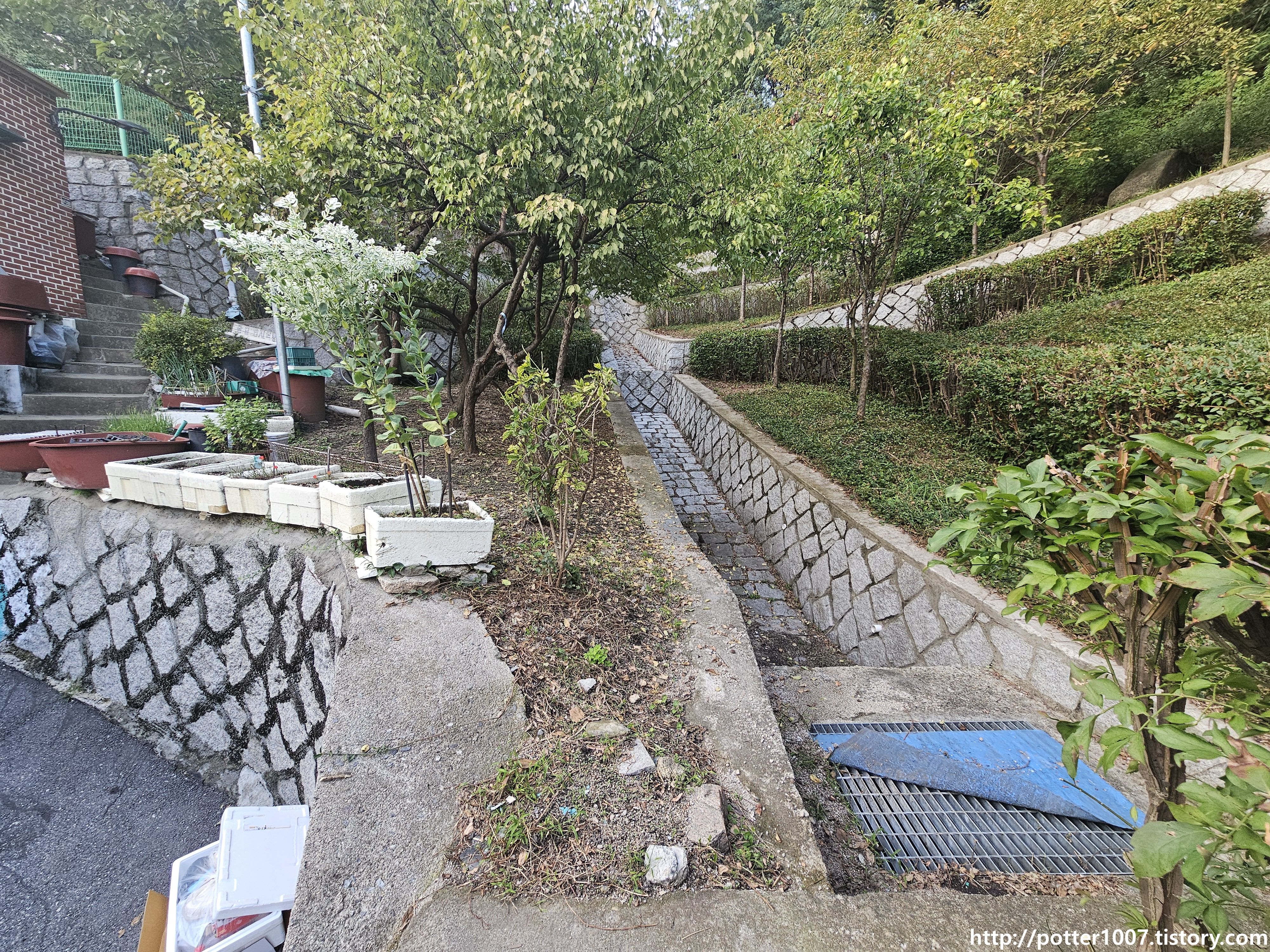 그러면 그 오른편에서 지천의 미복개구간을 볼수 있습니다. 사실상 석축을 쌓아 정비하면서 드러난 셈이지 그전에는 그냥 골짜기나 U자형 콘크리트 수로 박아놓은 형태였을 것으로 보입니다.