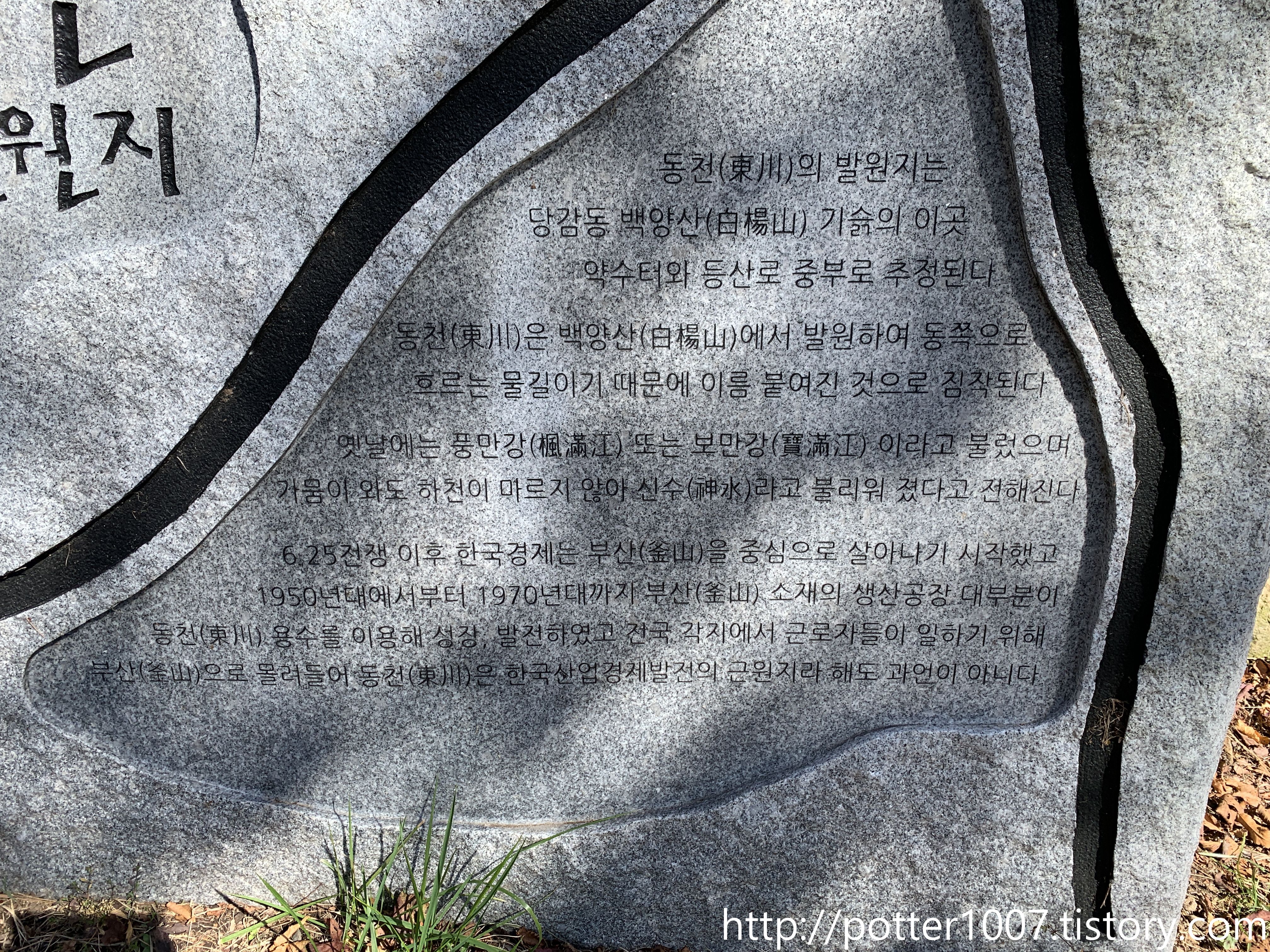 내용에 약간 애매한 부분이 있는데, 동천은 백양산에서 동쪽으로 흘러서가 아니고, 부산진성의 동쪽을 흘러서 동천이라 불린 것입니다.(부산진성의 위치는 현재의 자성대공원입니다.) 그리고 4편에서 언급했듯이 여기를 동천 발원지로 봐야하는지 당감천 발원지로 봐야하는지 단정짓기 어려운 면이 있습니다.
