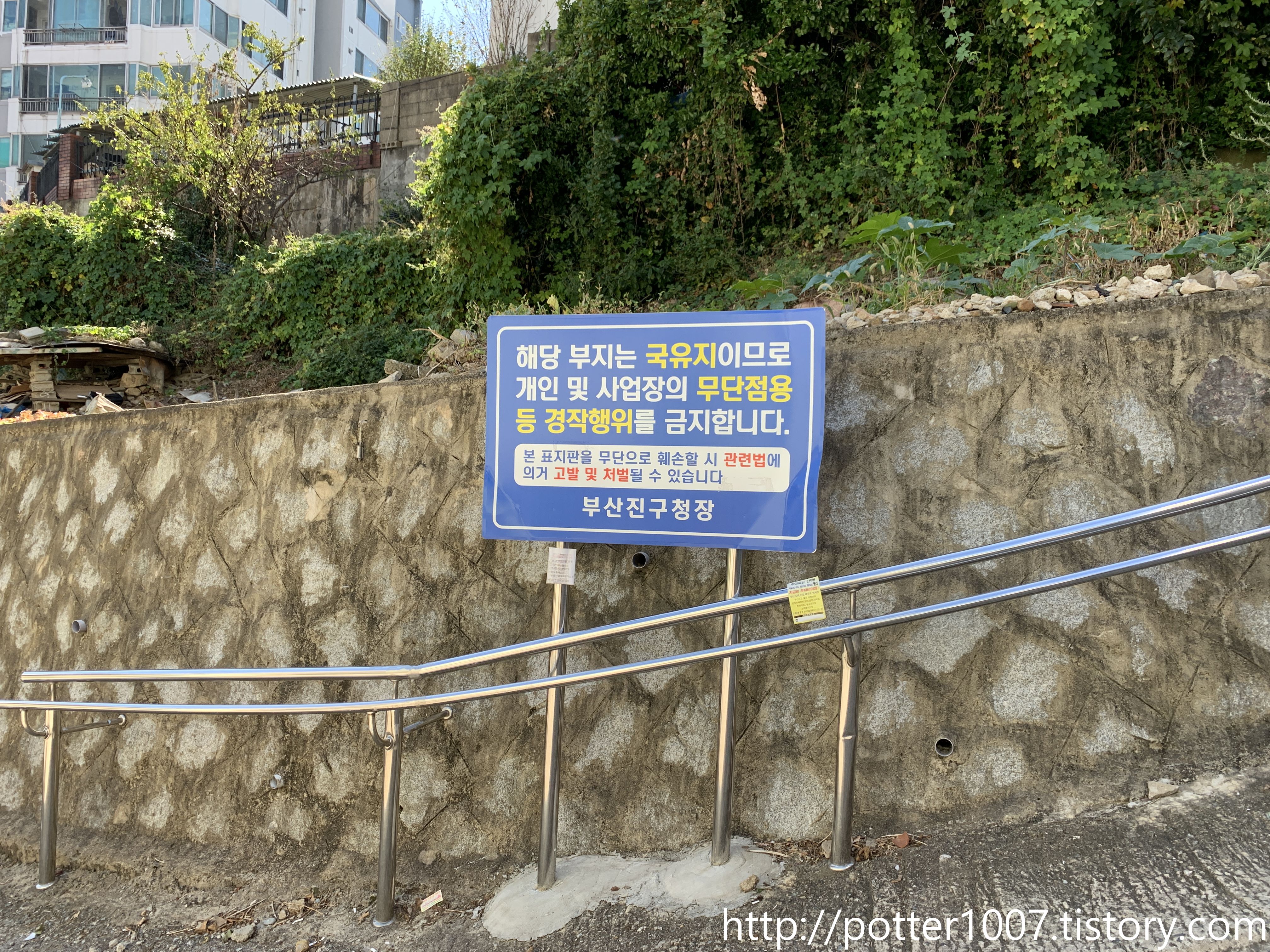 지천 옆 법면이 국유지인데, 사실 저부지까지 하천 부지라서 그렇습니다. 지도로 지번을 찍어보면 놀랍게도 이곳부터 백양대로 인근까지 하천 지목인 하나의 지번으로 되어있습니다.(부산 부산진구 당감동 818-160)