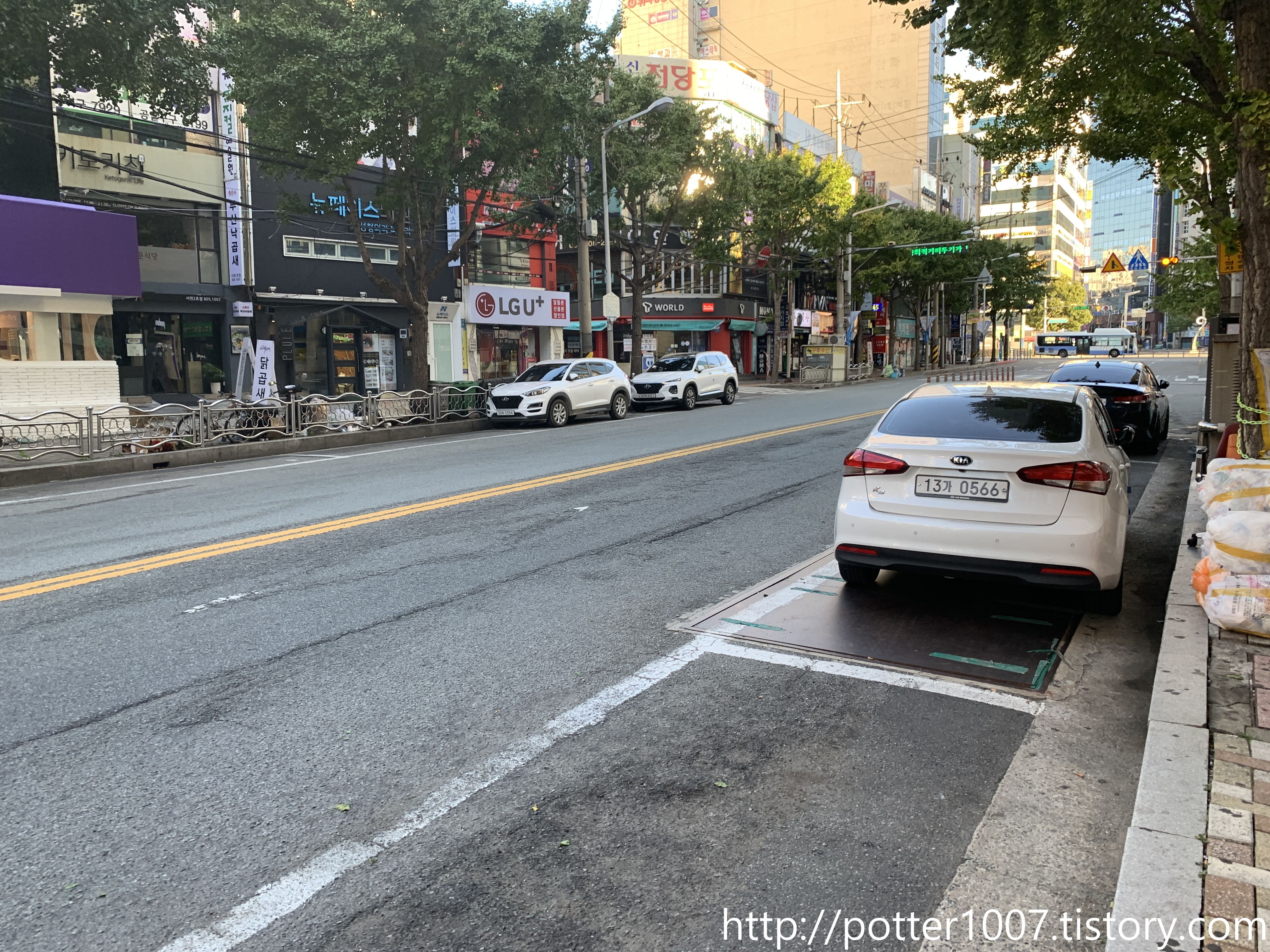 도로폭이 3~4차선이나 양옆을 주차장으로 쓰고 있습니다.