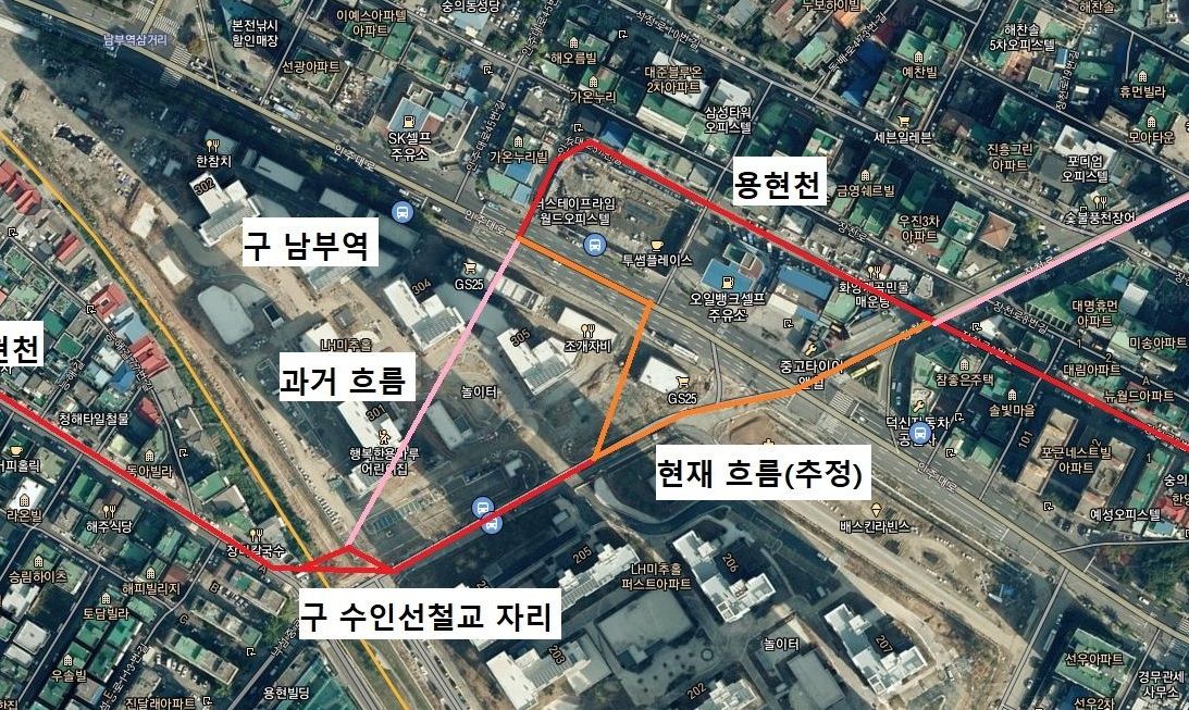 정확하게는 과거흐름과는 다른데, 과거 남부역이 있었을 시절에는 사진 기준 왼편으로 45도 각도로 흘렀습니다. 이 길은 당시에는 없었으며, 조금더 가면 있는 장천로와의 연결을 위해 도로를 이렇게 낸것으로 보입니다.
