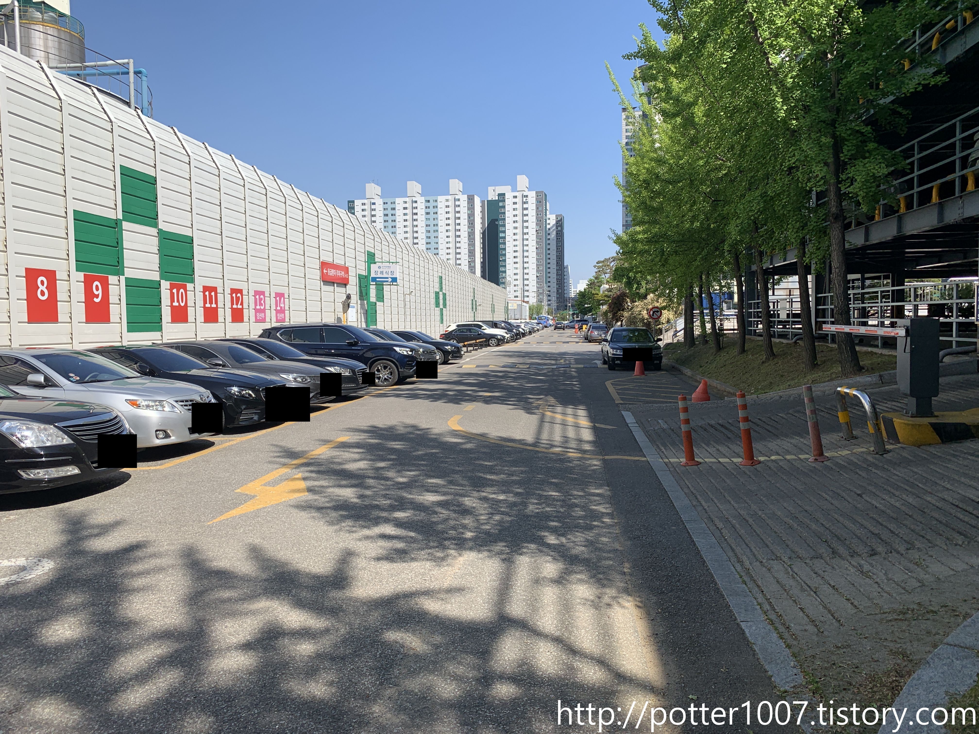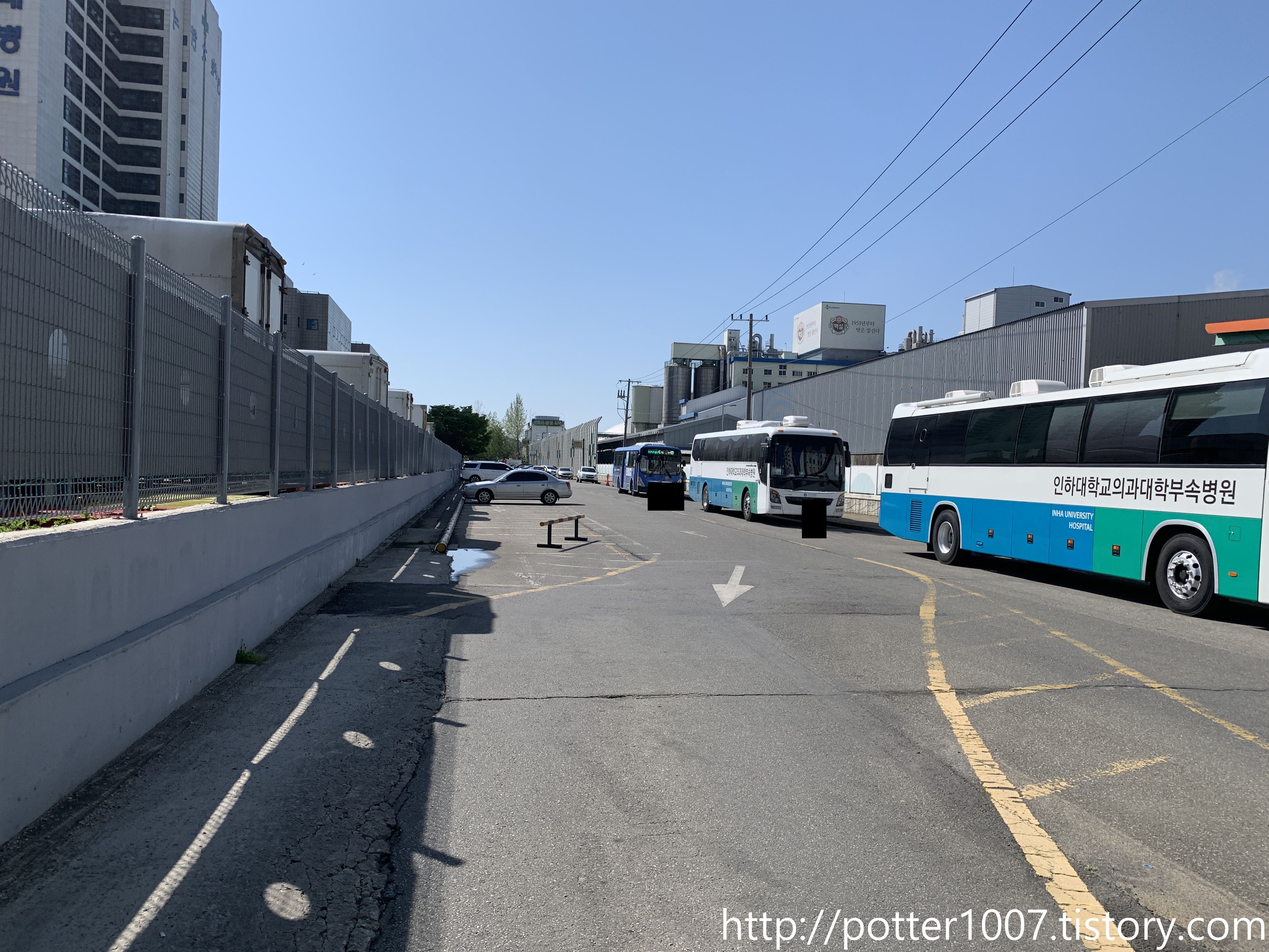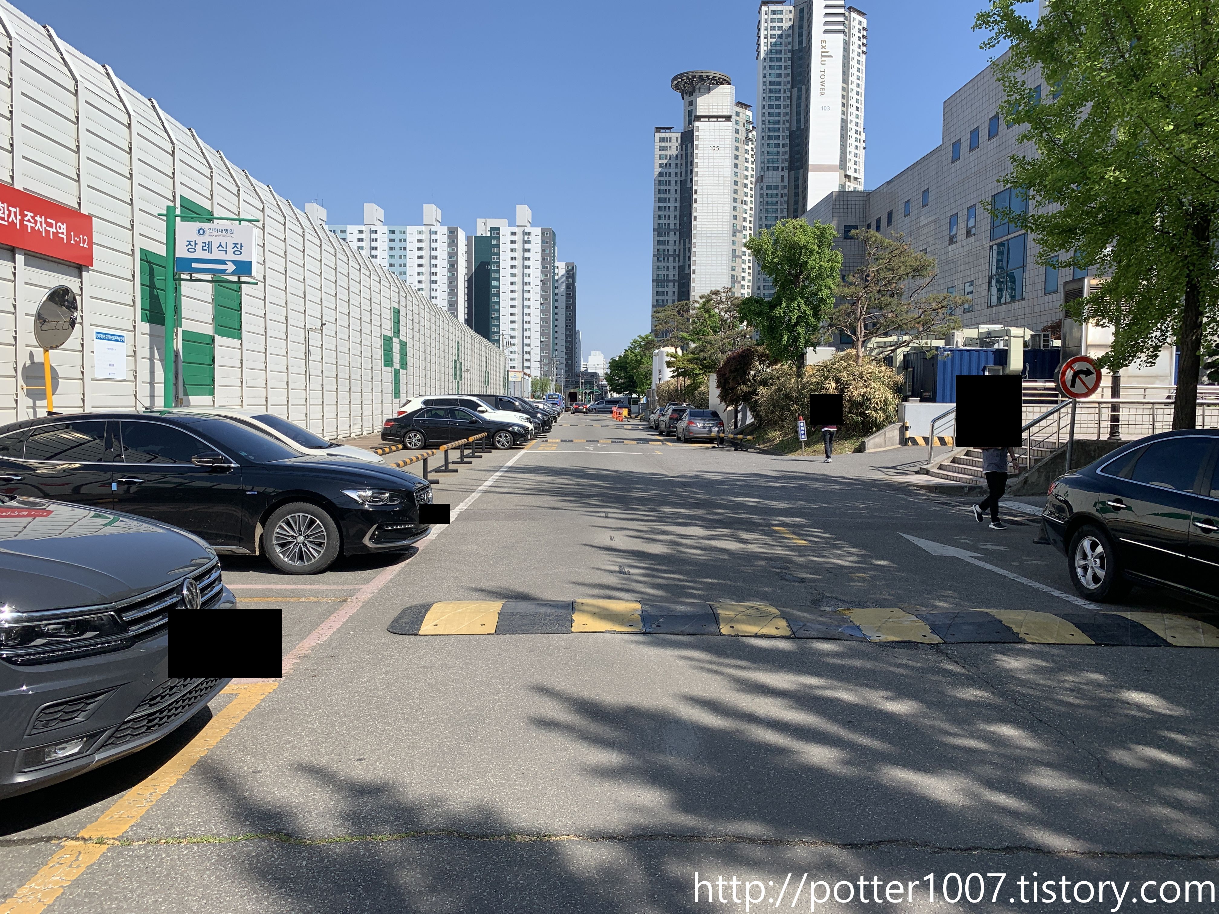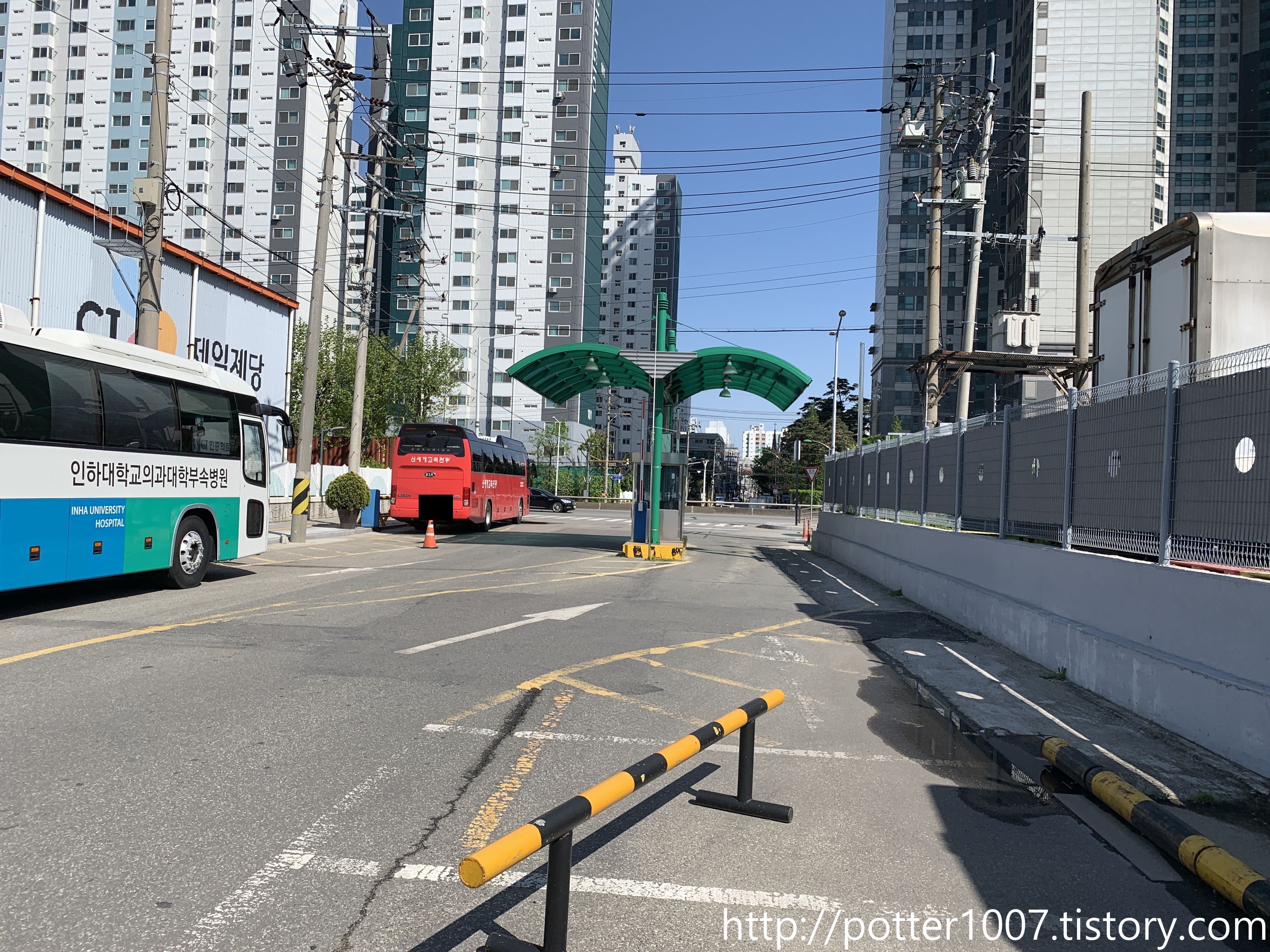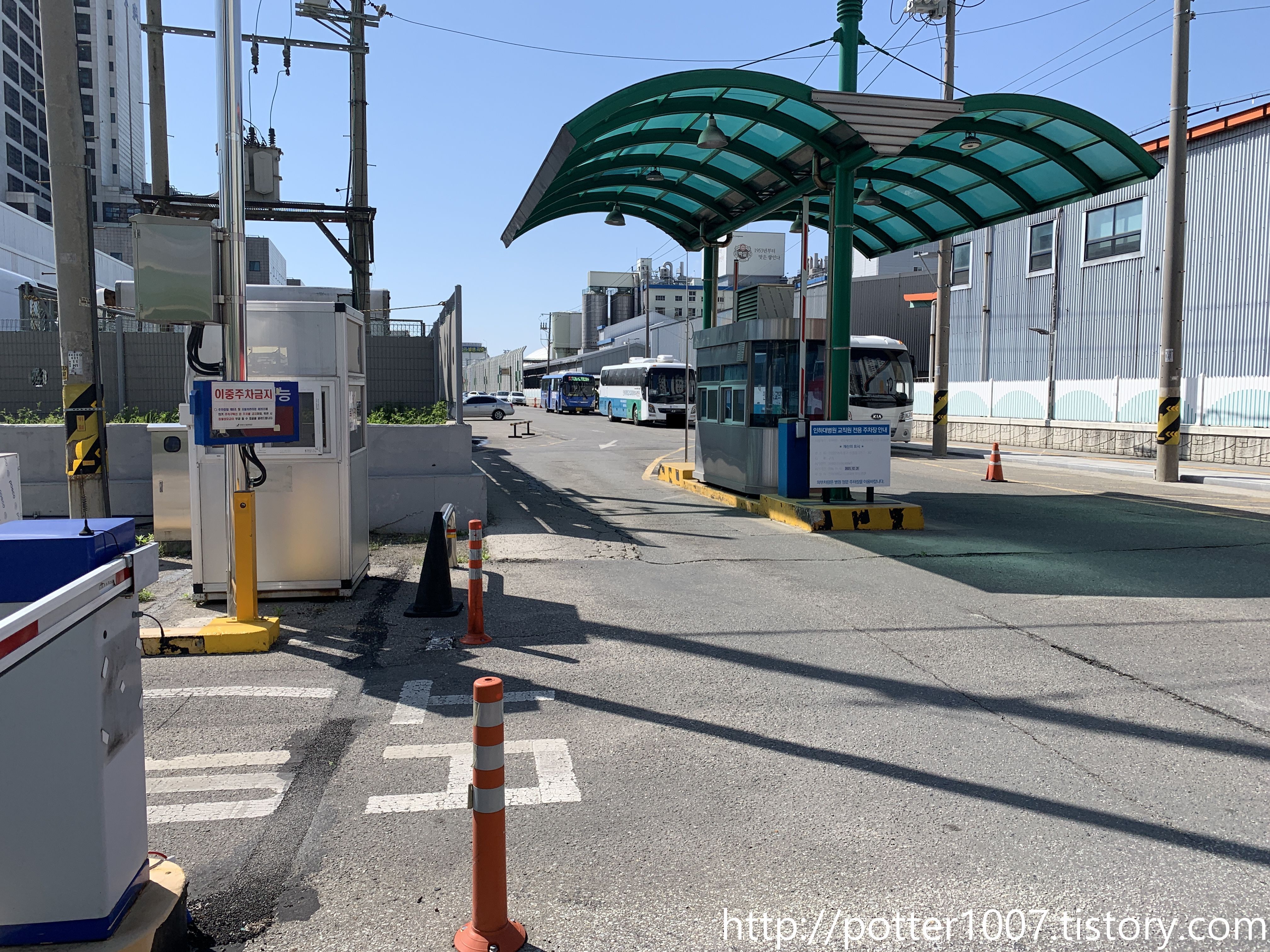 뒷길이 곧 인하대병원 주차장으로 들어가는 길이므로, 차단기와 부스가 설치되어 있습니다.