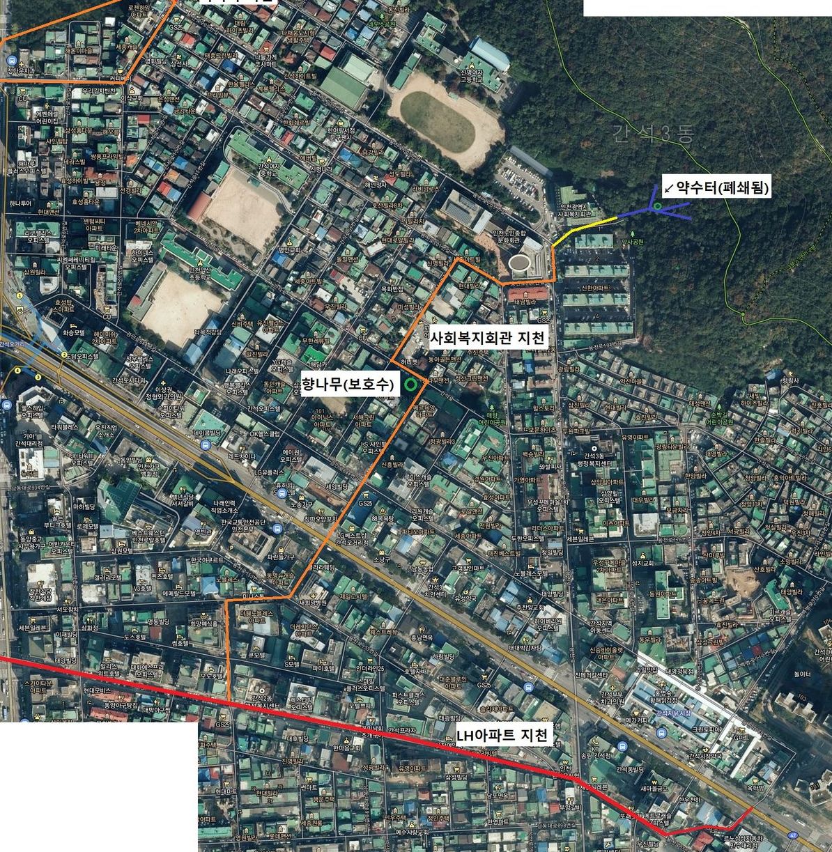 전체구간 지도입니다만, 사실상 사회복지회관 지천은 관으로 들어가기 때문에 중간부분은 과거의 위성사진을 참고하여 그린 추정구간입니다. 저구간에서 복개흔적은 눈꼽만큼도 찾기 어렵기 때문에(솔직히 저구간으로 흐르는지도 의문입니다), 굳이 애매한 구간의 답사기를 쓰는것보다 미복개구간을 보여드리는것이 더 나을것 같습니다.