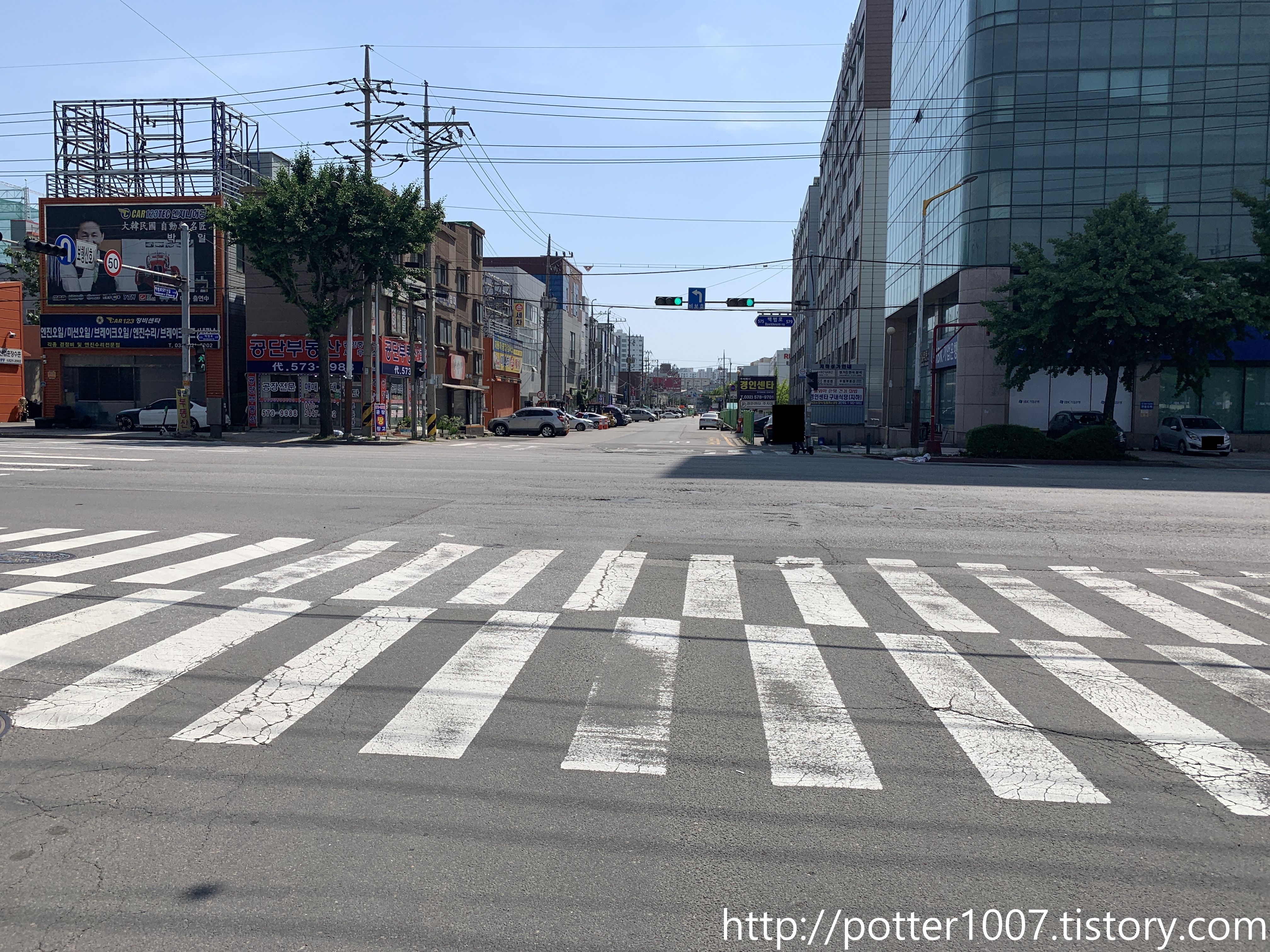살짝 방향이 틀어져 있는데, 도로가 사거리를 지나면 살짝 비틀어져서 그렇습니다.